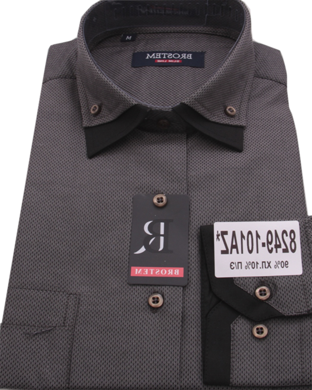 Молодежная рубашка красивого коричневого оттенка с принтом. Модель декорирована темно коричневыми полосками на воротнике и манжетах.