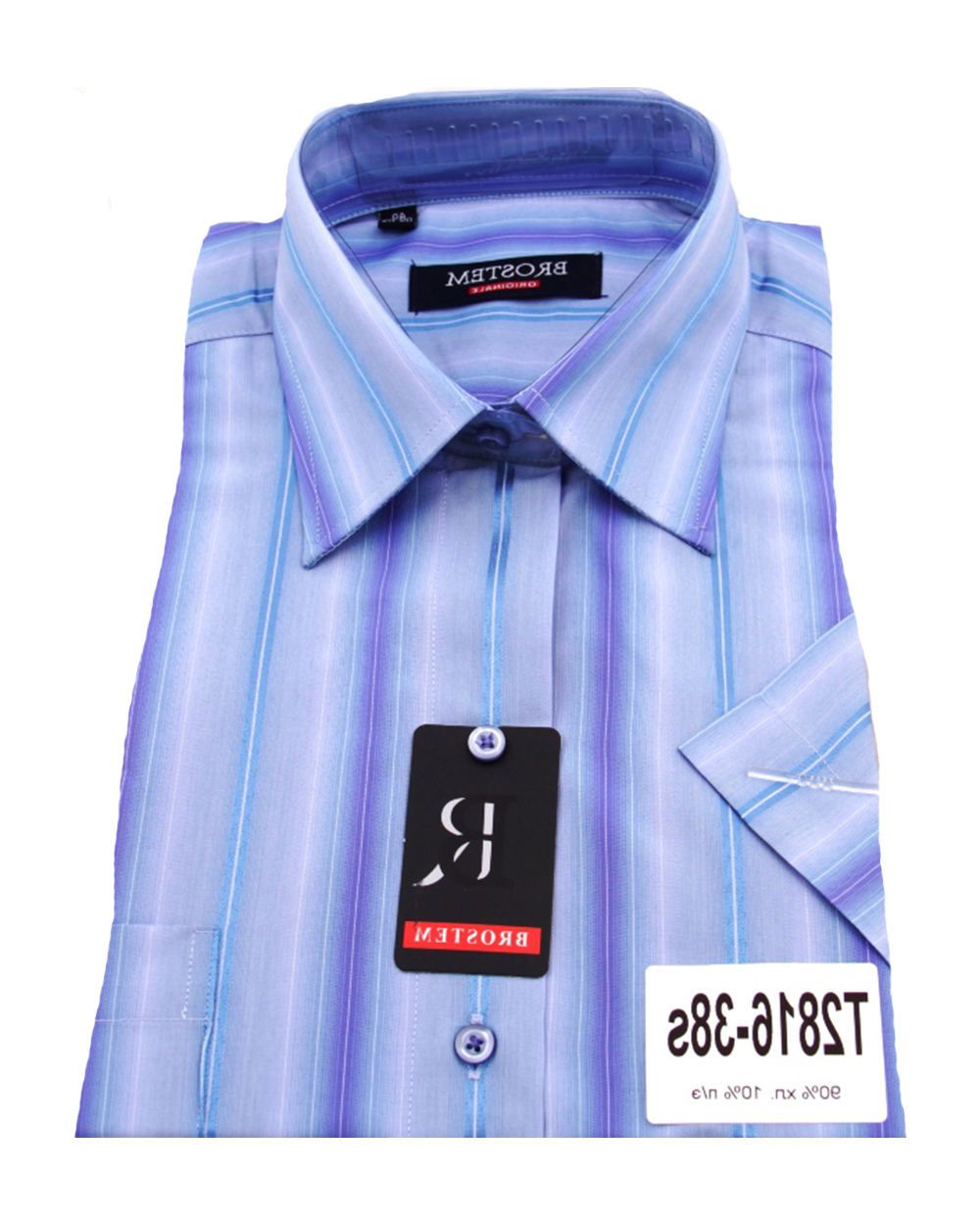 Стильная рубашка светло-голубого цвета в фиолетовую полоску отлично дополнит гардероб делового мужчины. Модель выполненная из натурального материала, она идеально сидит на теле.