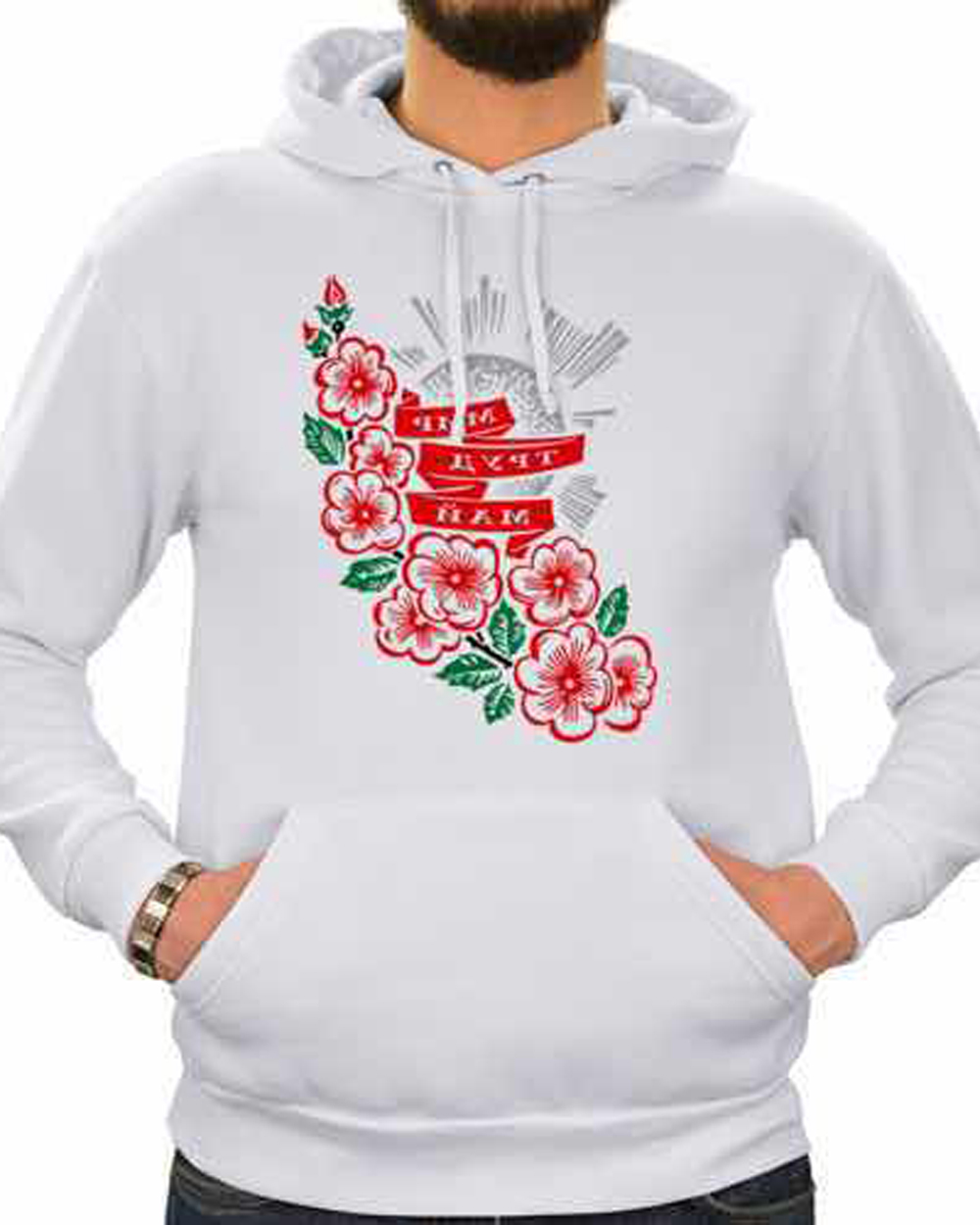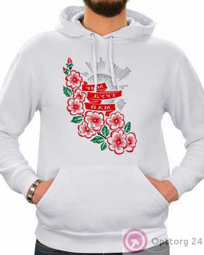 Оригинальная толстовка белого цвета с принтом в виде цветущей ветки и надписью Мир Труд Май. Модель очень удобная, с капюшоном и большими карманами. Замечательно подойдет для любителей casual стиля.