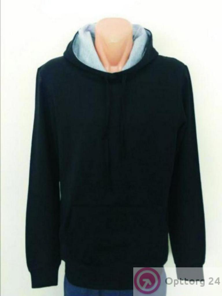 Черная толстовка для мужчин с карманами и капюшоном. Внутренняя часть капюшона белого цвета.