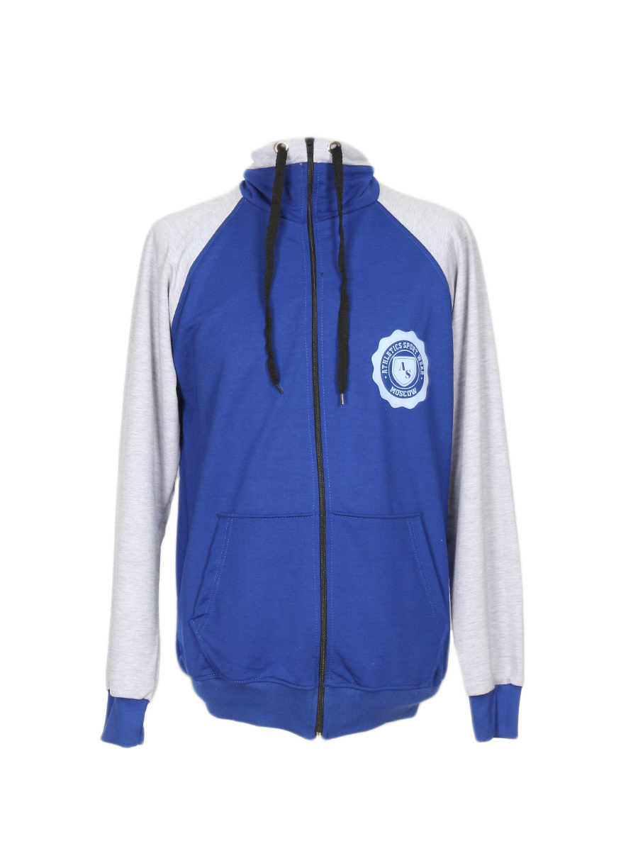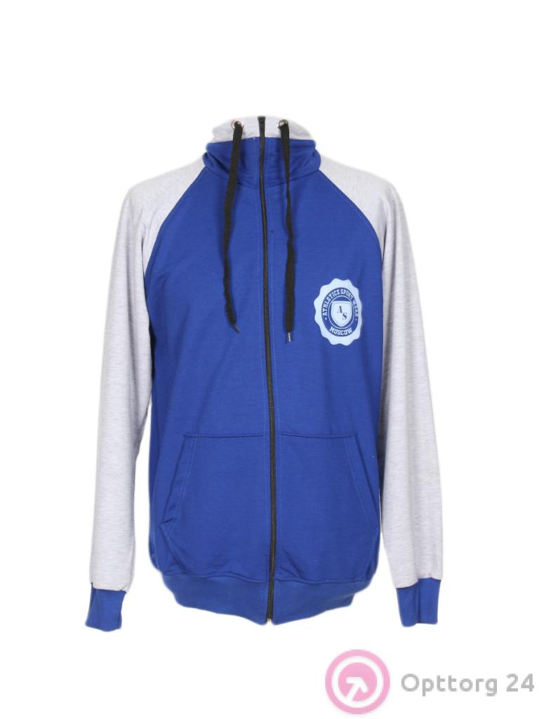 Толстовка мужская на молнии синего цвета с серыми рукавами. Модель имеет высокий воротybr, карманы в нижней части, а так же надпись "Athletics sport" на груди с левой стороны.