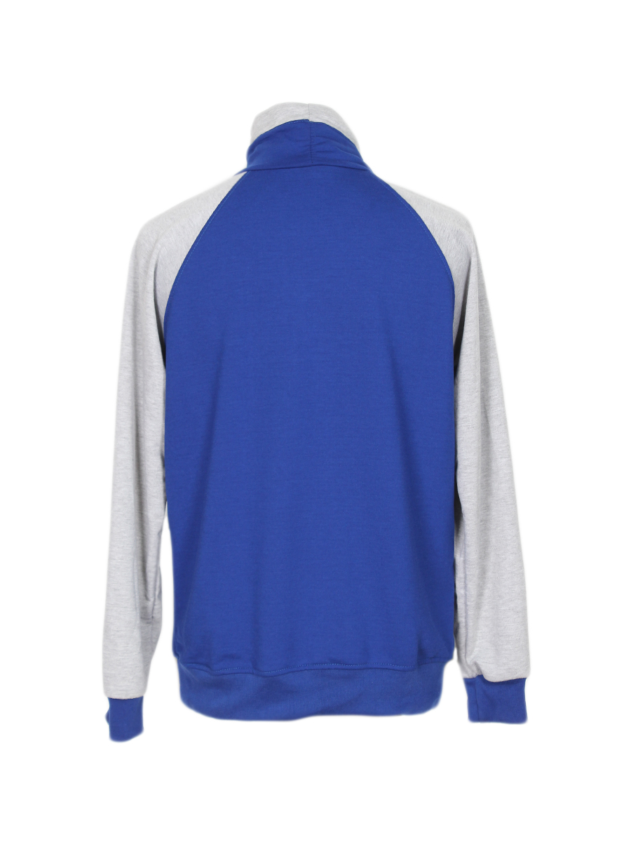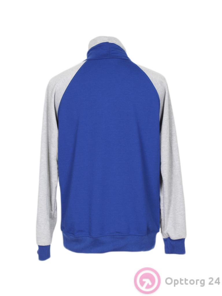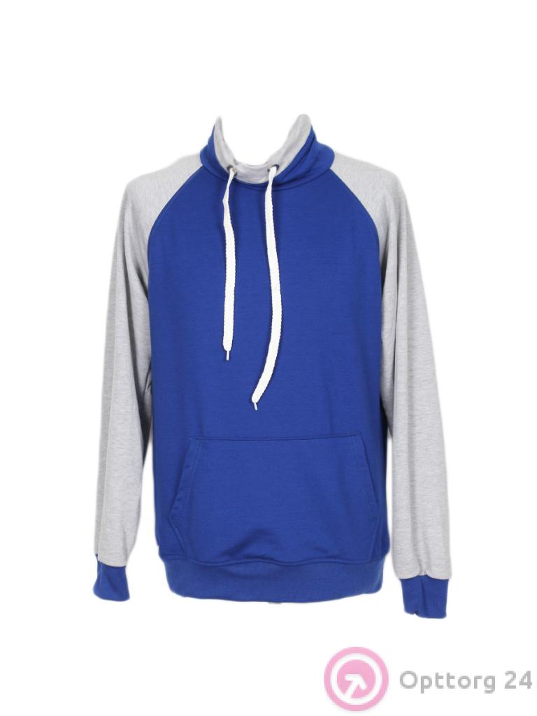 Толстовка мужская синего цвета с светло-серыми рукавами. Модель имеет высокий ворот и двухсторонний карман в области живота.