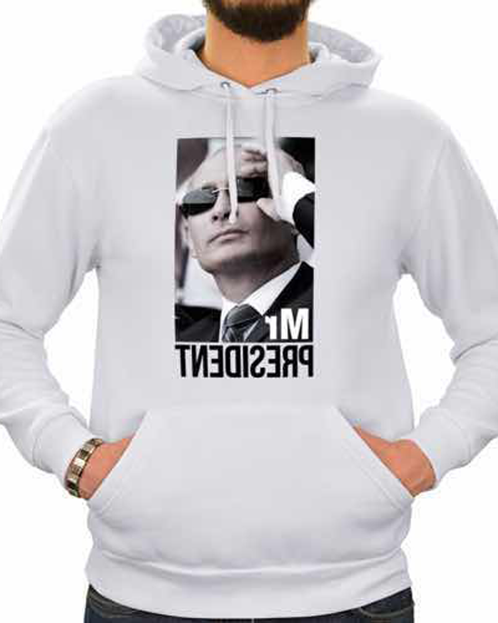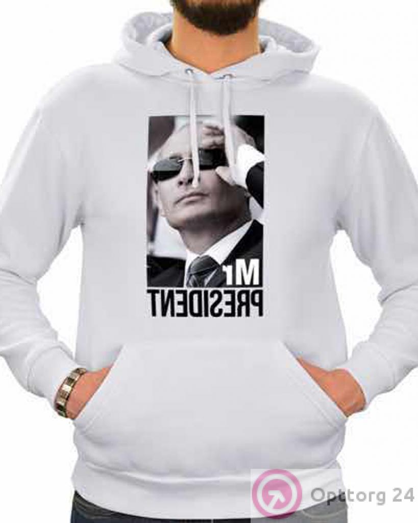 Модная теплая толстовка белого цвета с принтом Mr President. Модель имеет два больших кармана и капюшон со шнурками. Толстовка с длинными рукавами, отделаными эластичными манжетами. Отлично дополнит гардероб почитателей спортивного стиля.