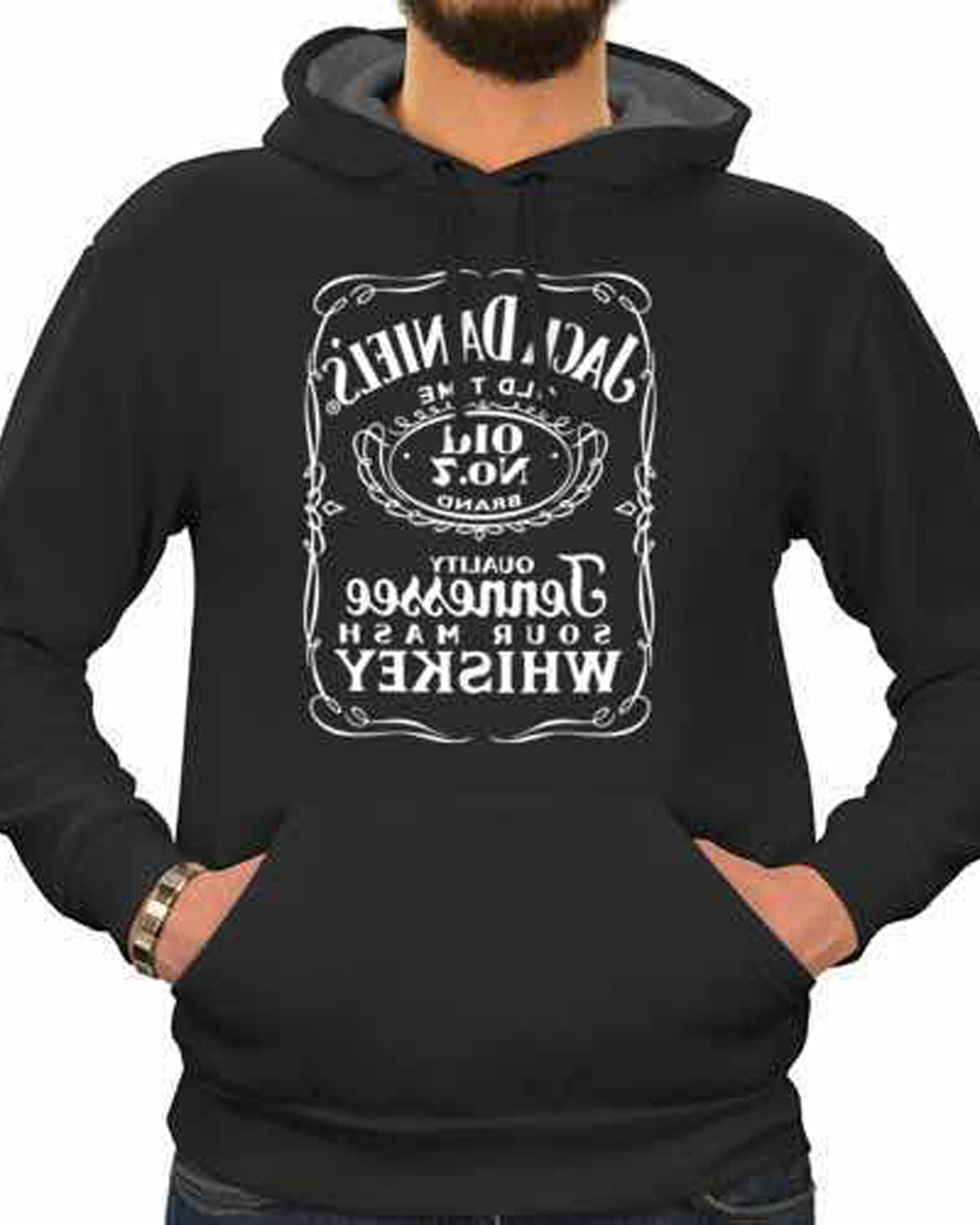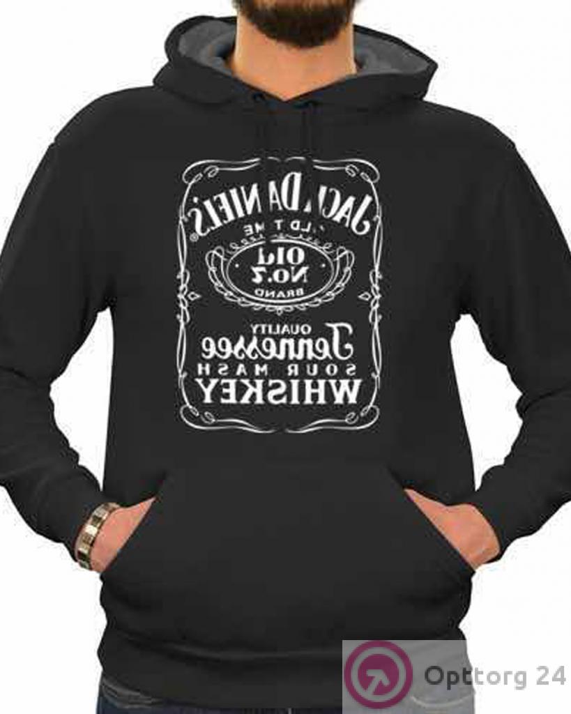 Стильная толстовка с капюшоном, сделана из качественного утепленного материала. Модель универсального черного цвета, подойдет для ежедневной носки. Спереди нанесен большой принт с надписью Jack Daniels. Низ и рукава отделаны широкими манжетами. По боках сделаны два больших кармана.