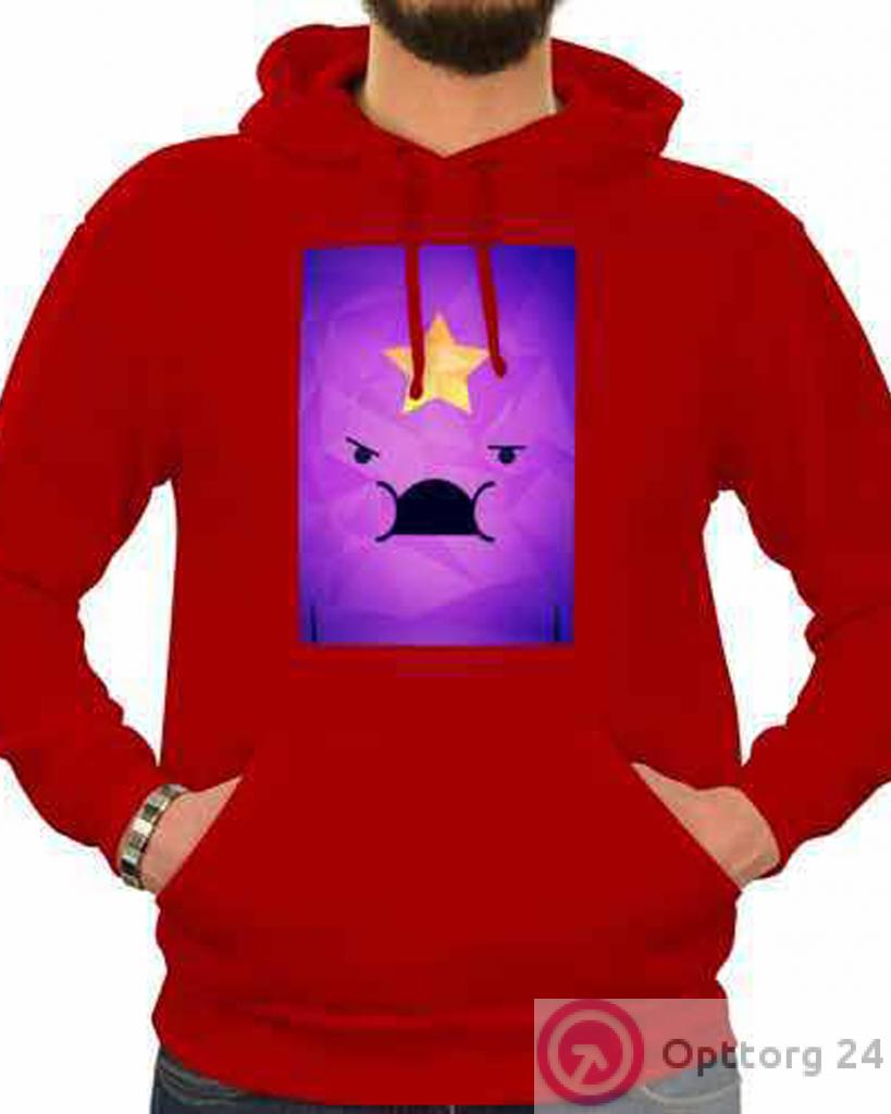 Красивая стильная толстовка, представлена в красном цвете. Модель с капюшоном. Спереди нанесен принт фиолетового цвета. Толстовка универсальная, подойдет как женщинам, так и мужчинам.
