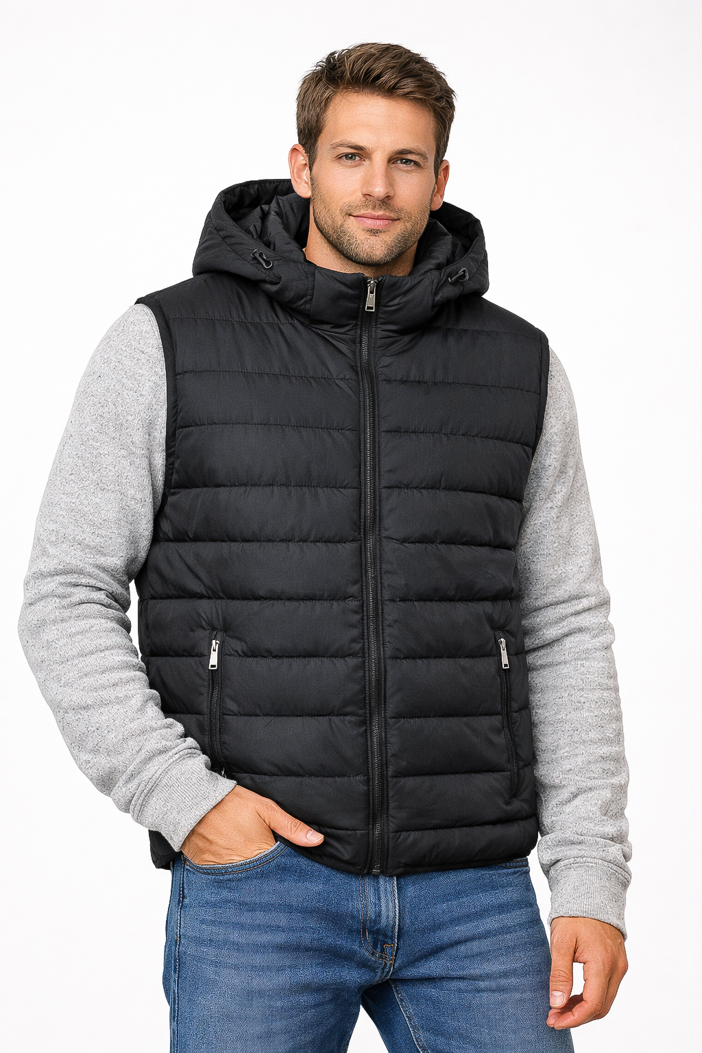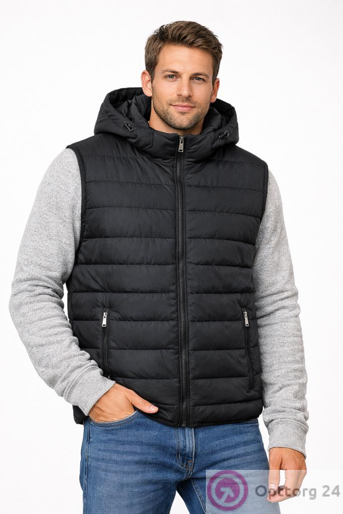 Черный мужской жилет с карманами и капюшоном на синтепоне. Застежка модели на молнии. Стильное и теплое изделие.