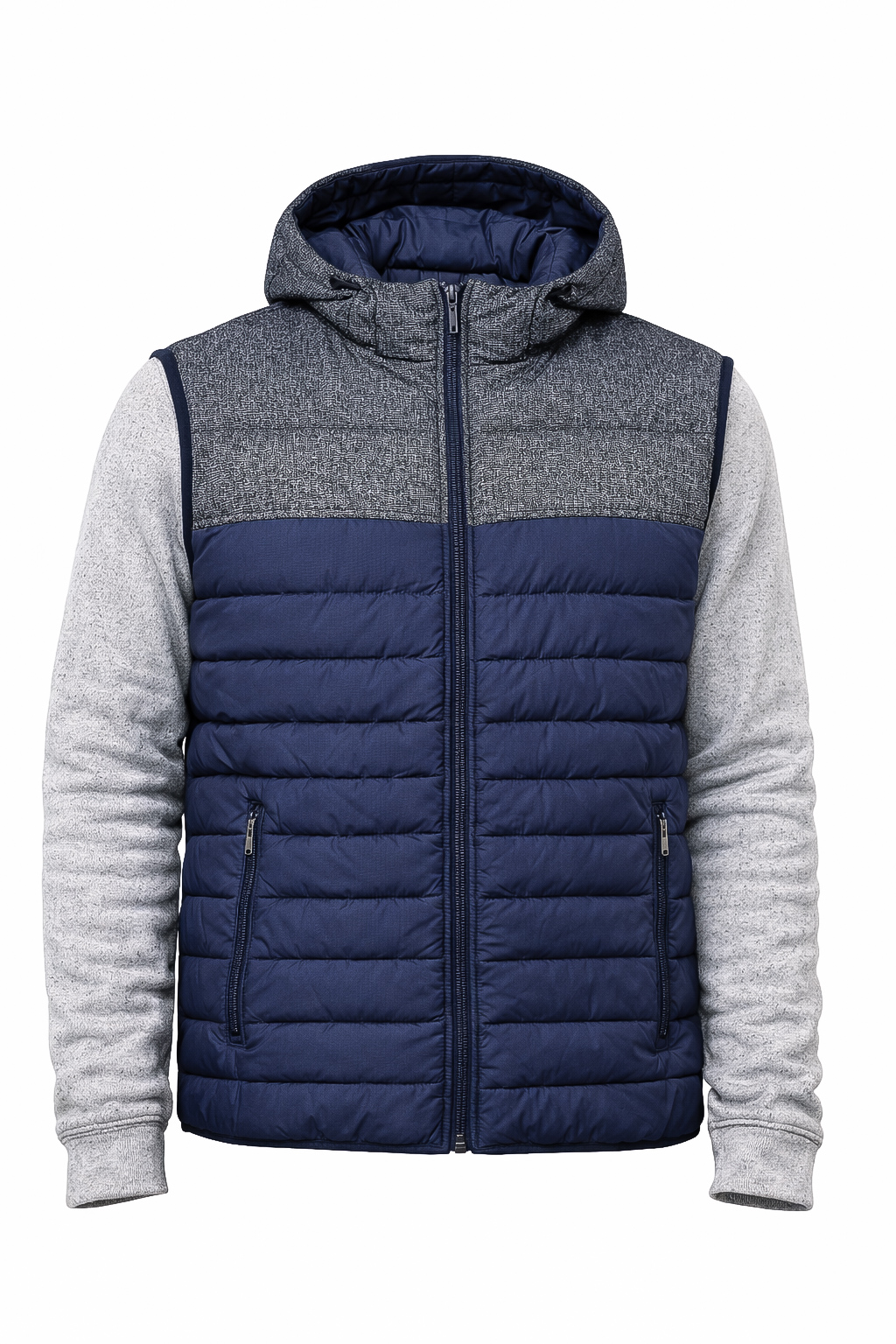 Теплая модель жилета для мужчины на синтепоне. Изделие двухцветное, сверху серое, снизу синее. Жилет имеет капюшон и карманы. Застежка на молнии.