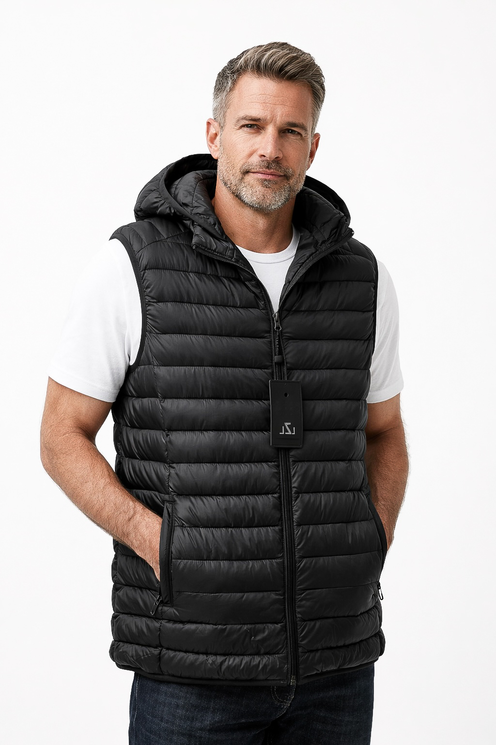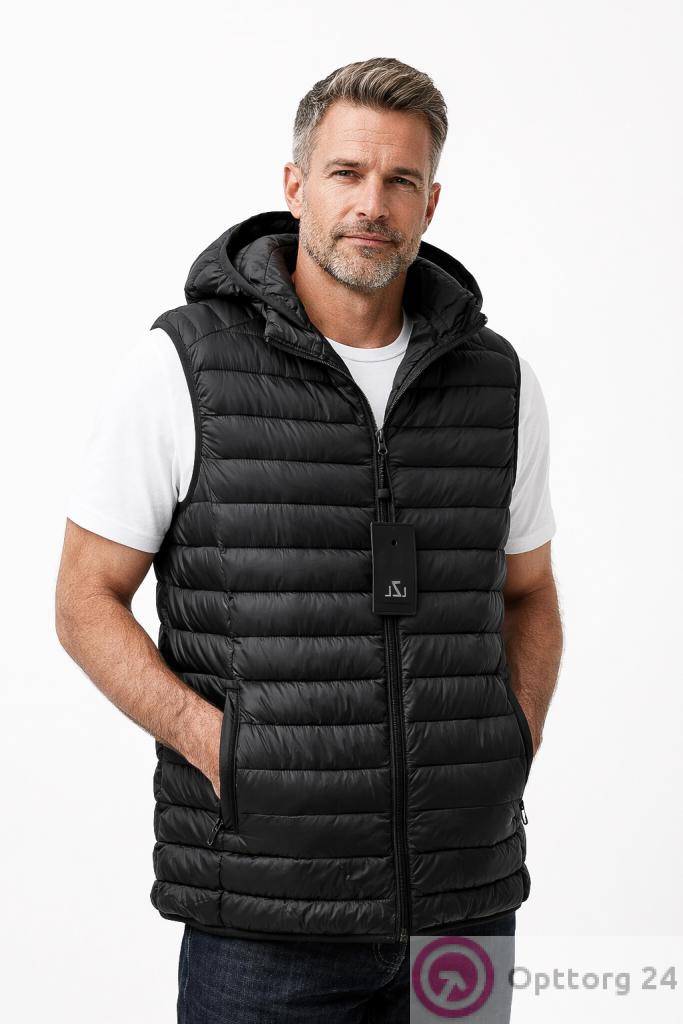 Описание: Жилет мужской стеганный на синтепоне (большие размеры), однотонного цвета. Высокий воротник. Застежка на молнии. Есть капюшон и два кармана на молнии.