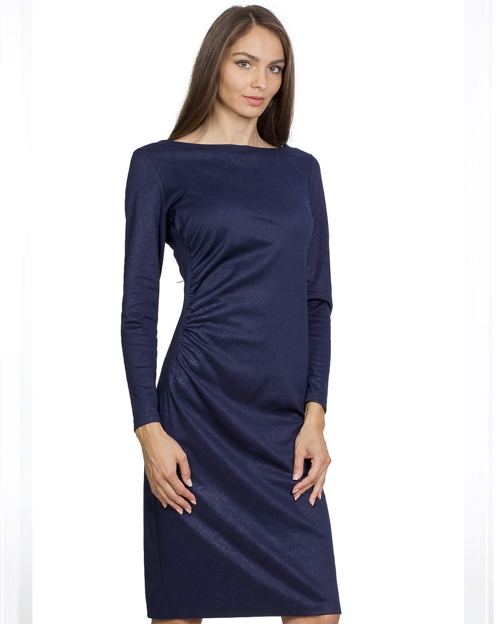 Милое, привлекательное платье тёмно синего цвета. Хорошо сочитается с высоким каблуком.
