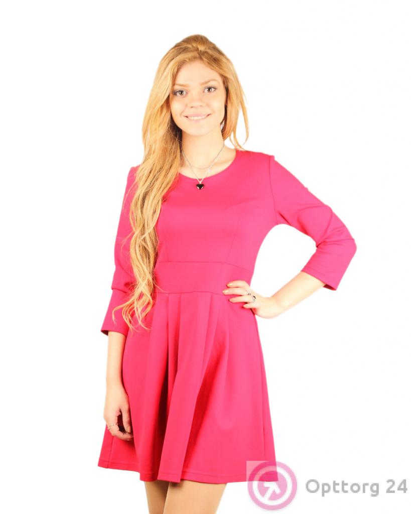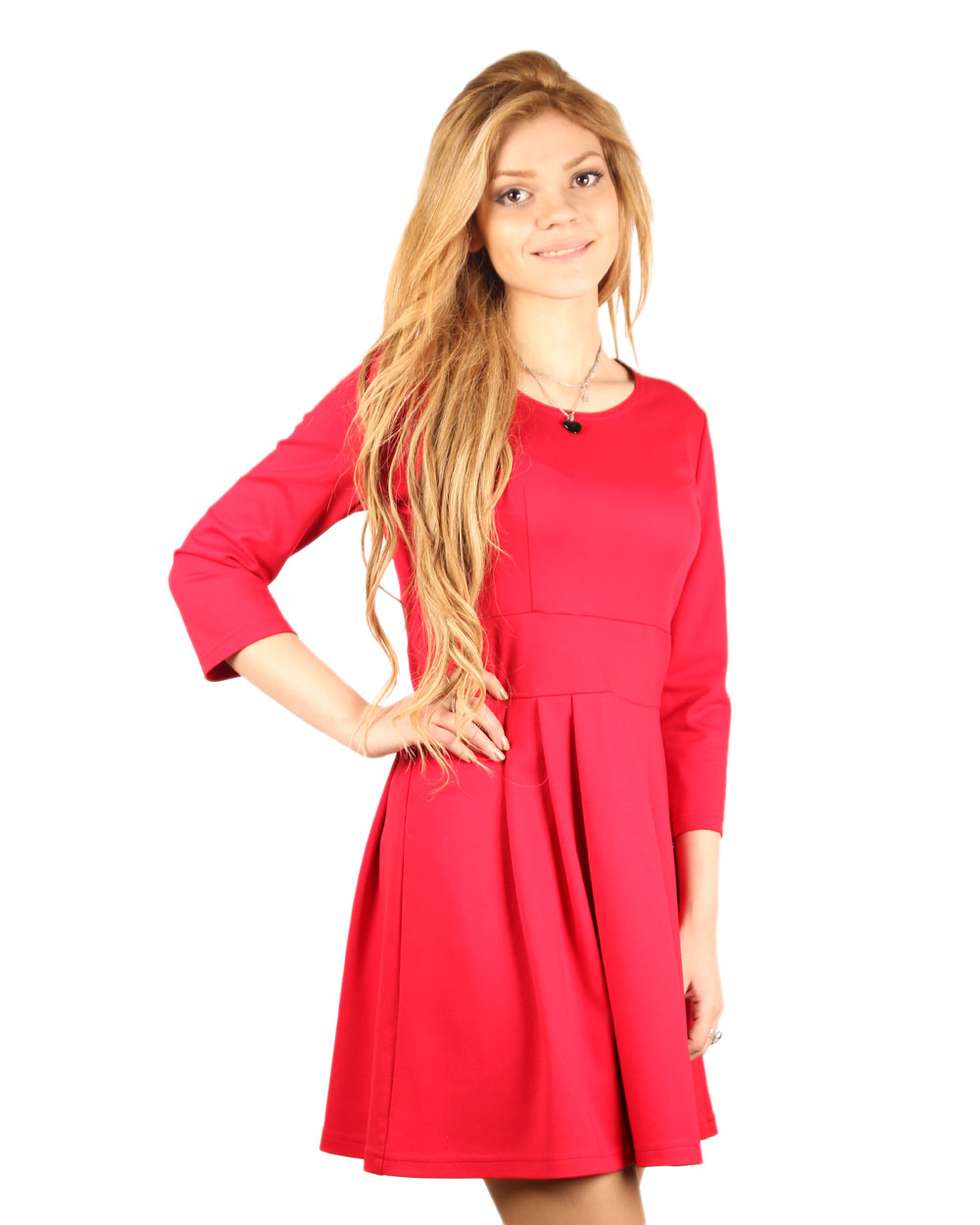 Красивое платье длинной до колена красного цвета. На линии талии сделана широкая вставка в тон платью. Горловина овальной формы, рукав 3/4. Модель платья универсального фасона, его можно носить как на работу, так и на вечеринку или прогулку.