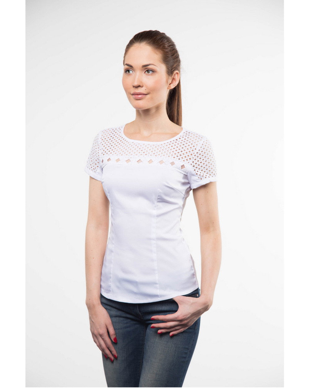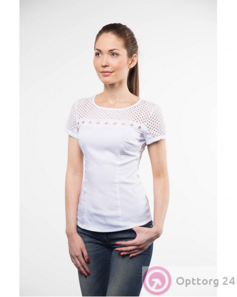 Элегантная белая блузка с короткими рукавами. Изделие украшено ажурными вставками.