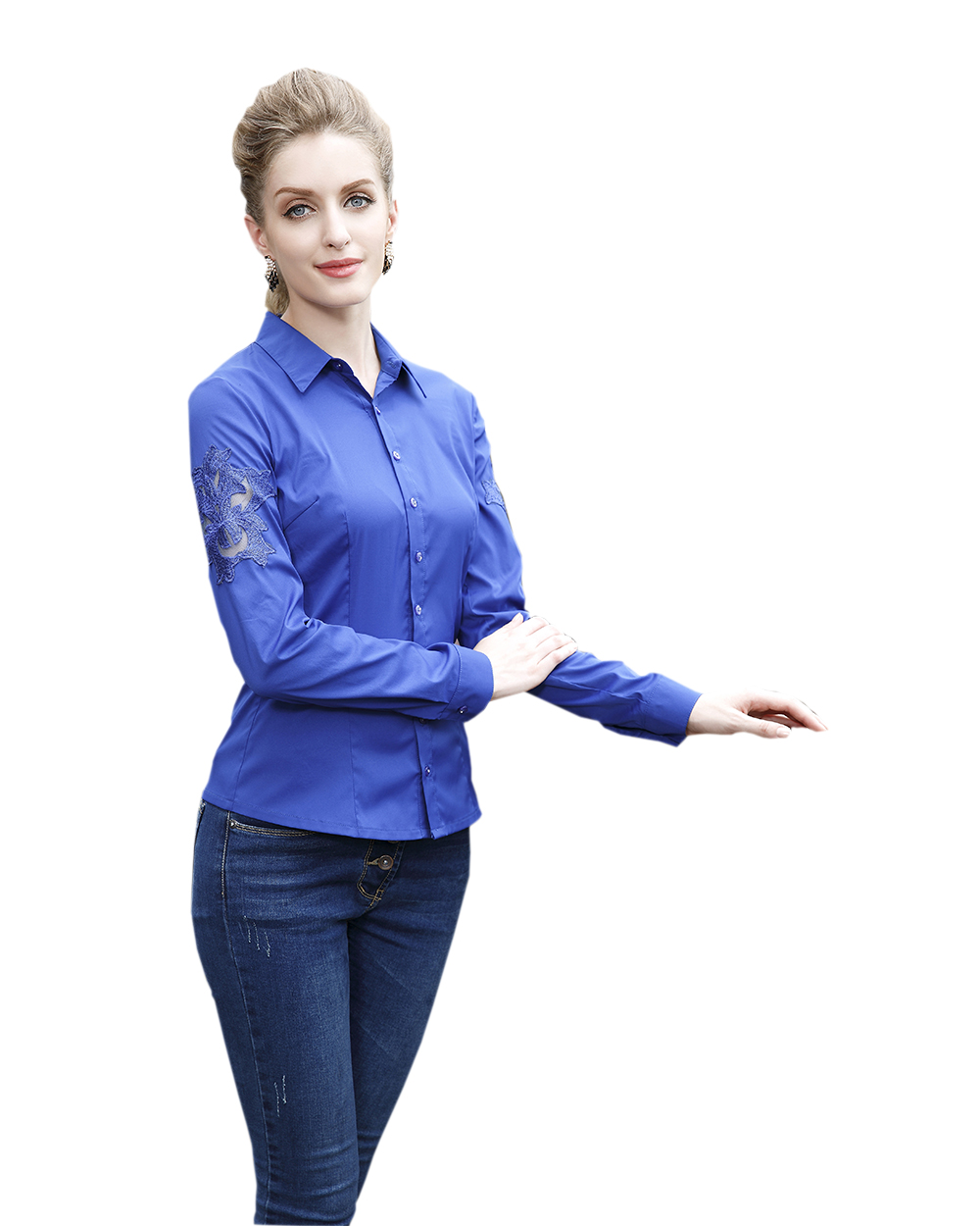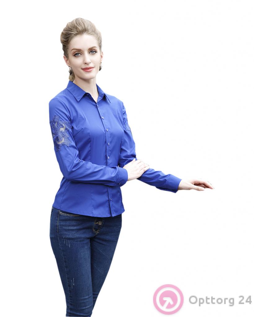 Женская блузка однотонного синего цвета с небольшой гипюровой вставкой на рукавах. Изделие легко сочетается с брюками, юбкой или классической офисной одеждой.