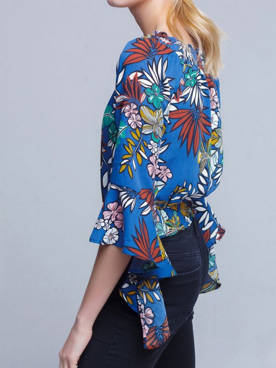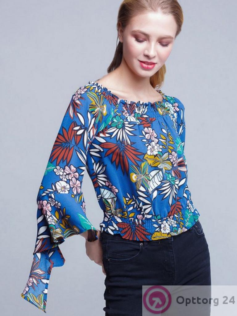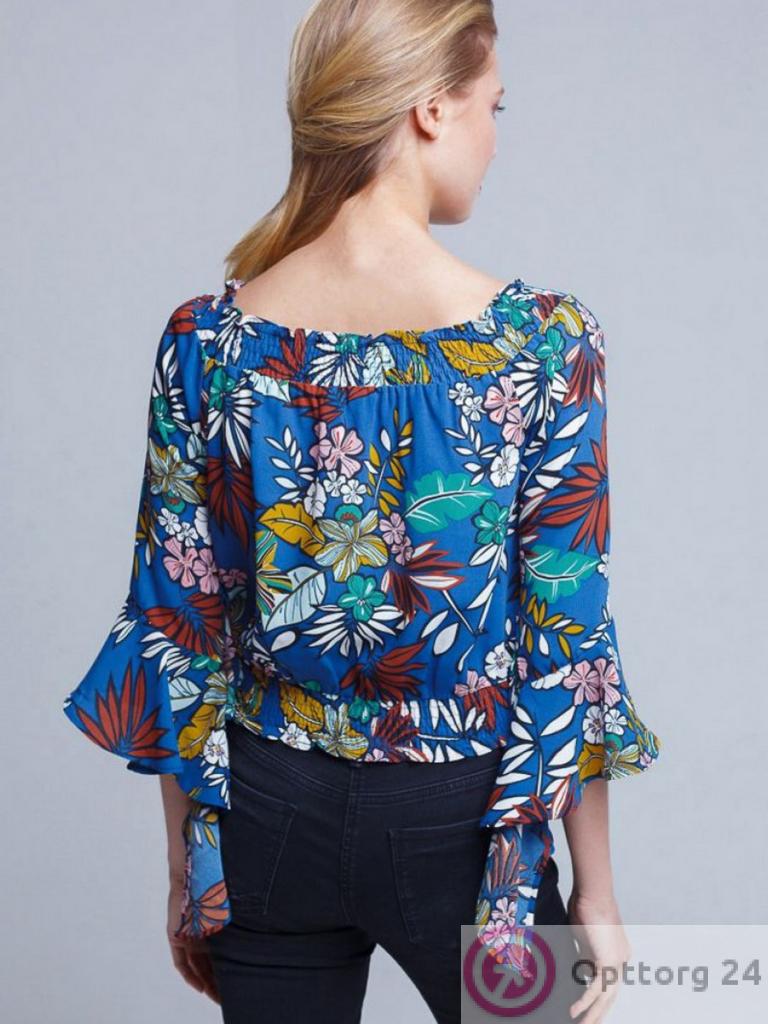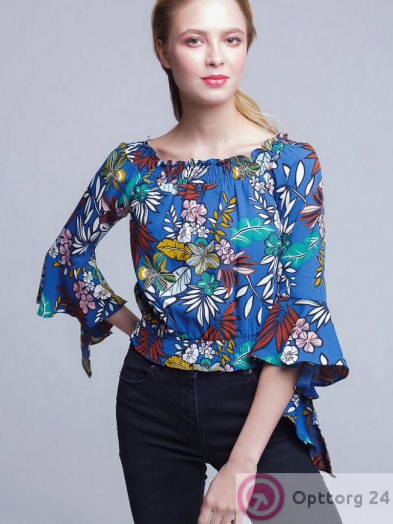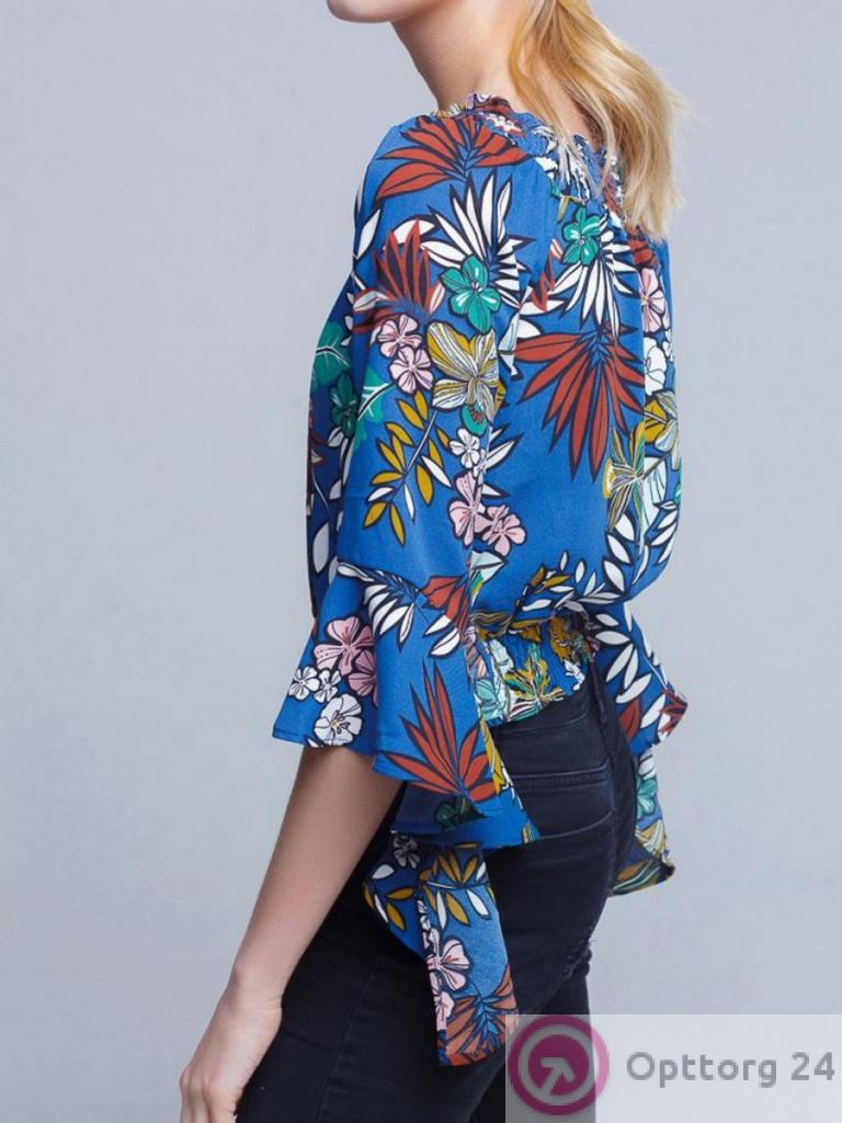 Яркая блузка для молодых женщин с цветочным принтом. Изделие имеет глубокий вырез, расклешенные рукава 3/4 и пояс на резинке. Модная и стильная модель.