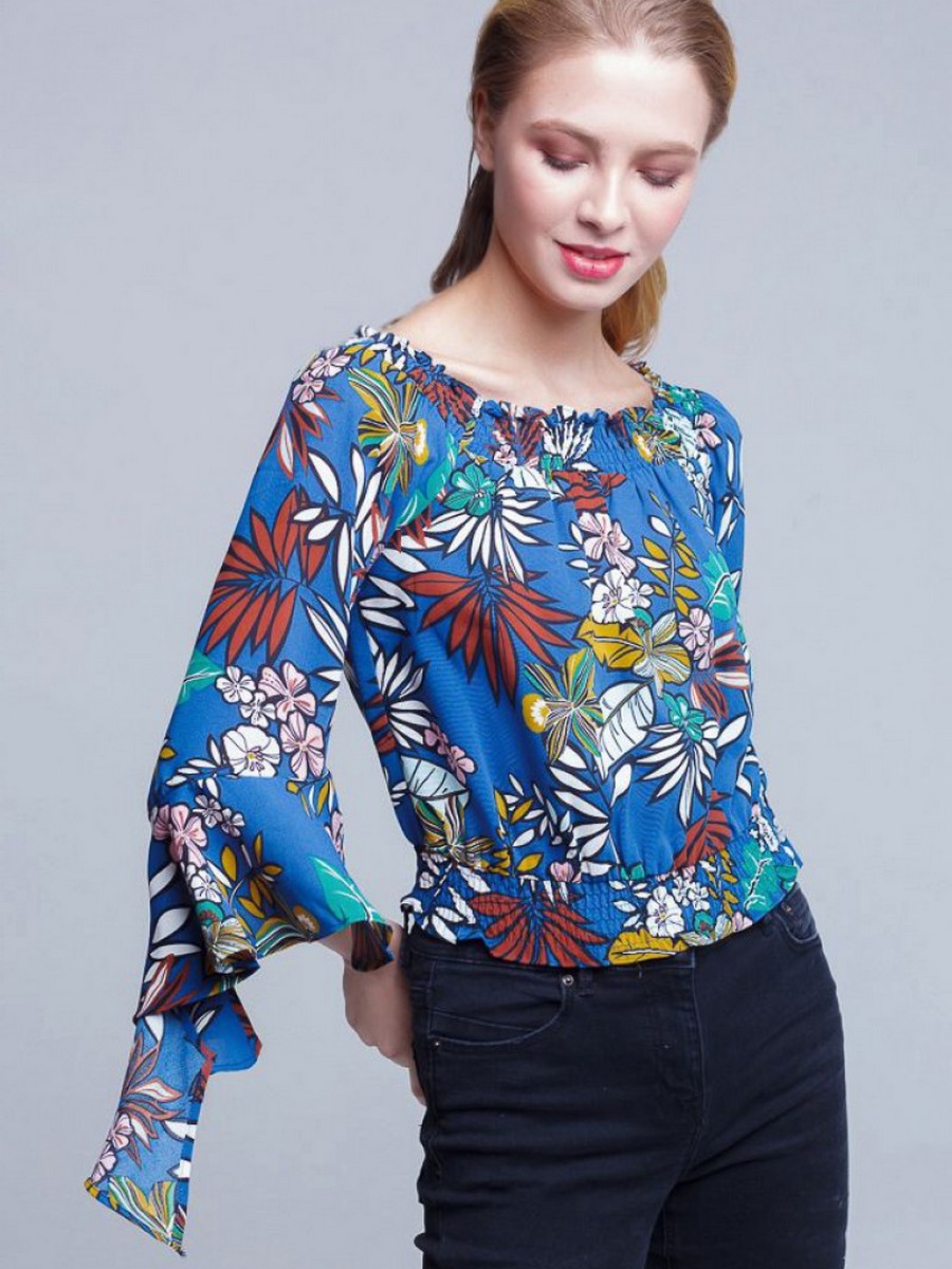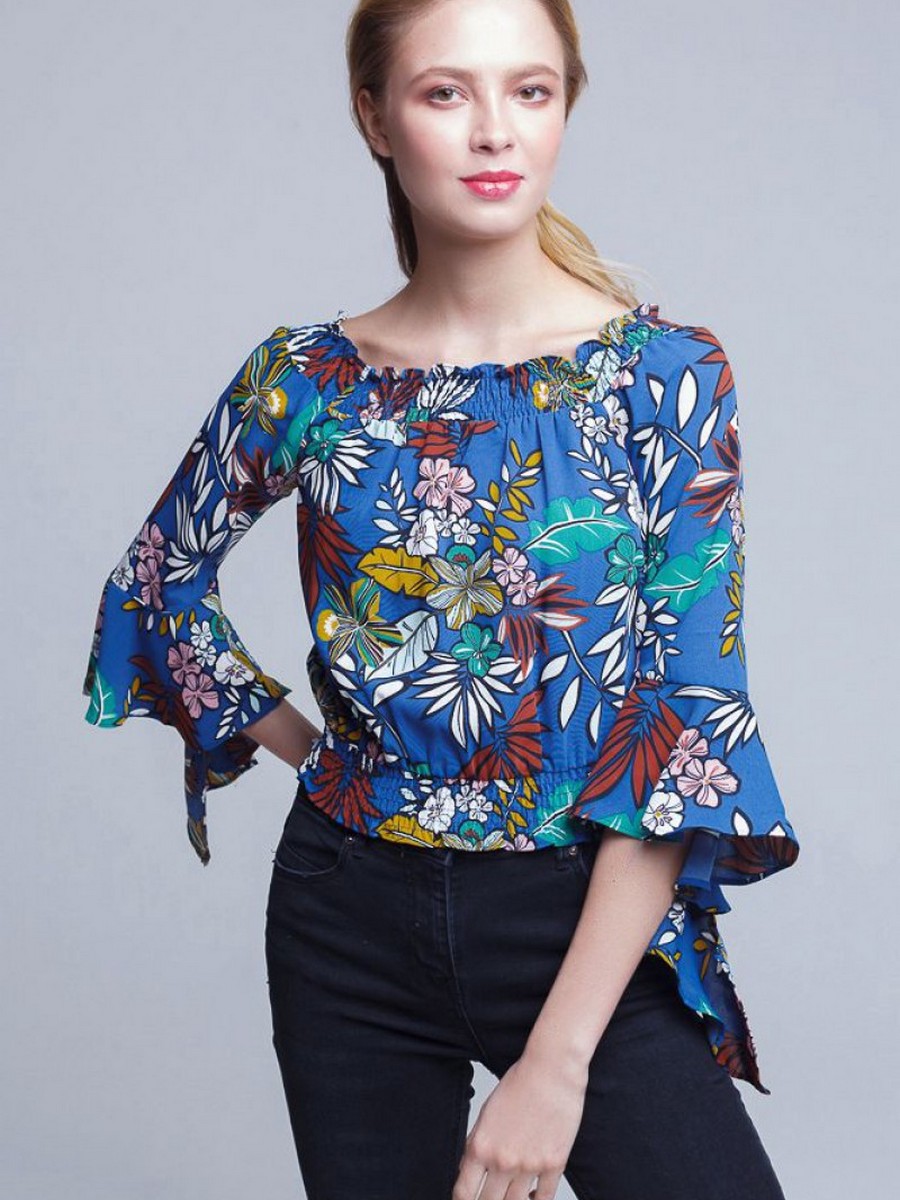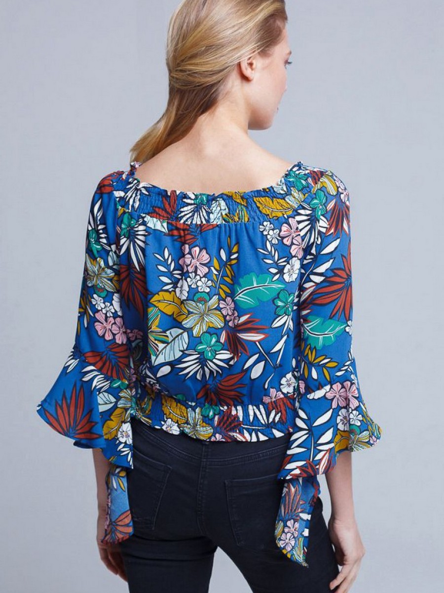 Яркая блузка для молодых женщин с цветочным принтом. Изделие имеет глубокий вырез, расклешенные рукава 3/4 и пояс на резинке. Модная и стильная модель.