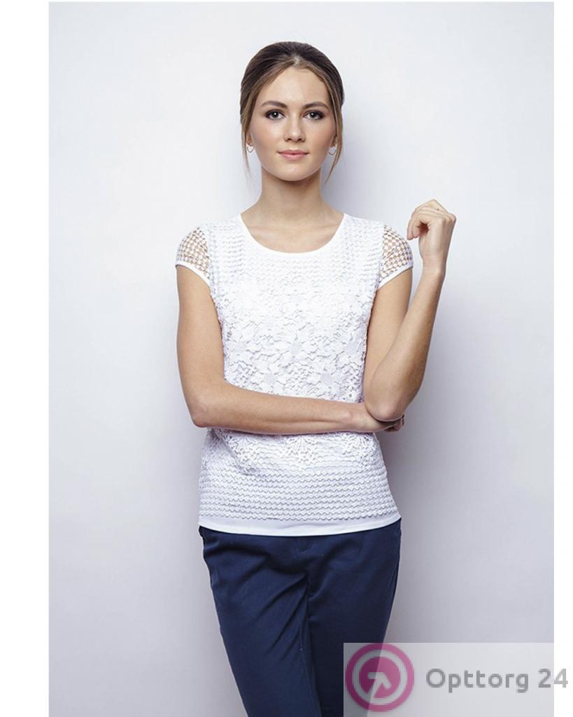 Неробыкновенно нарядная белая блузка с облегающим силуэтом. Спереди модель украшена узорчатой гипюровой тканью. Короткие рукава выполнены из тонкого кружева.