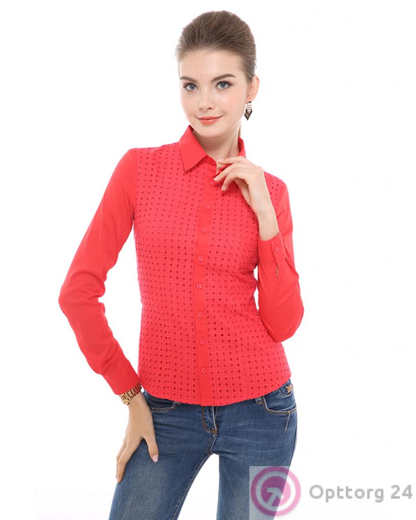 Оригинальная женская блузка, скомбинирована из двух видов ткани: перед х/б ткань, спинка и рукава из хлопка с добавлением полиэстра и эластана. Модель застегивается на пуговички, рукава длинные. Красивый коралловый цвет.