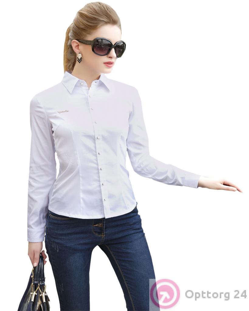Стильная белая блузка приталенного кроя. Модель отличается длинным рукавом и металлической лейбой на груди.