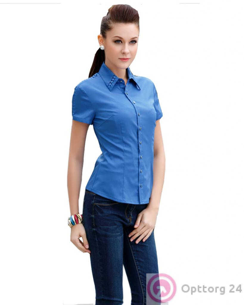 Блузка короткий рукав синяя украшена на воротнике и рукавах оптом