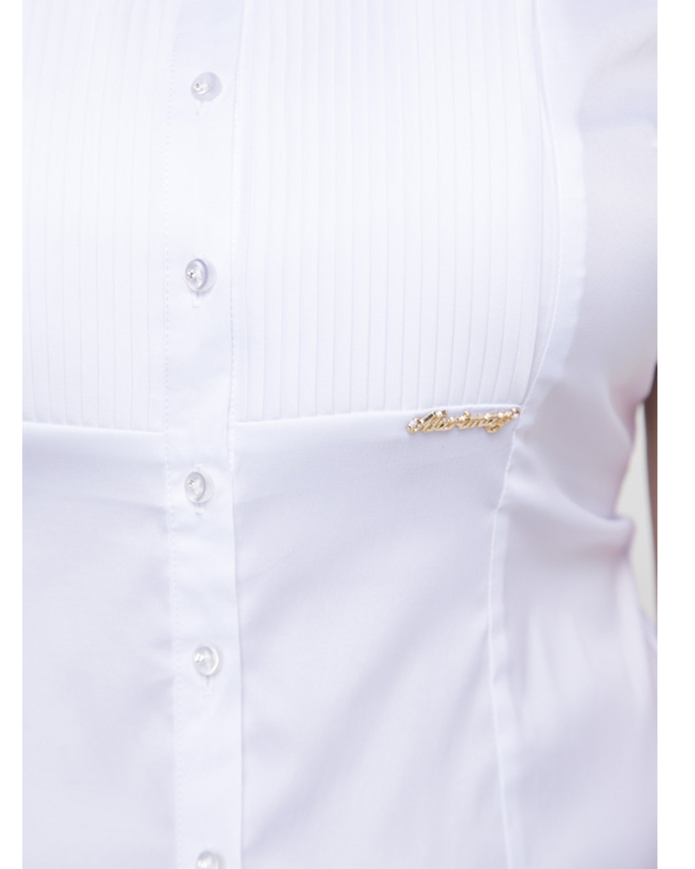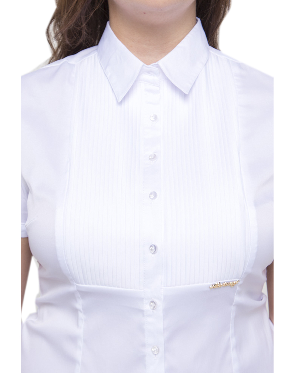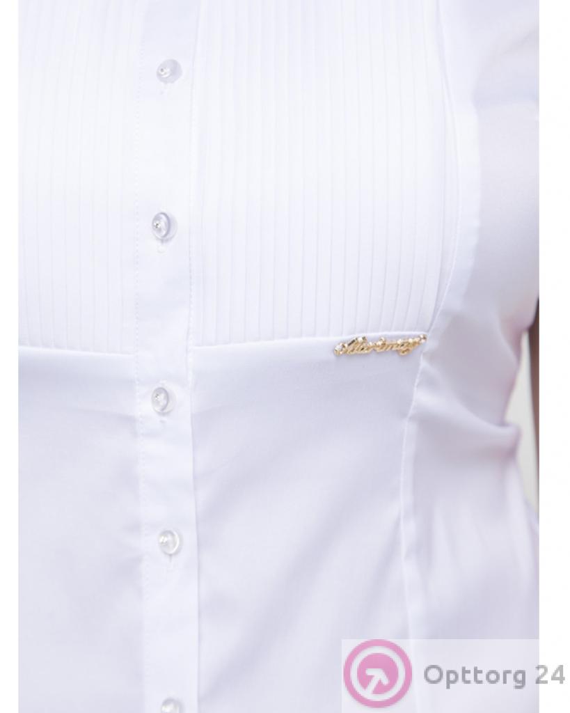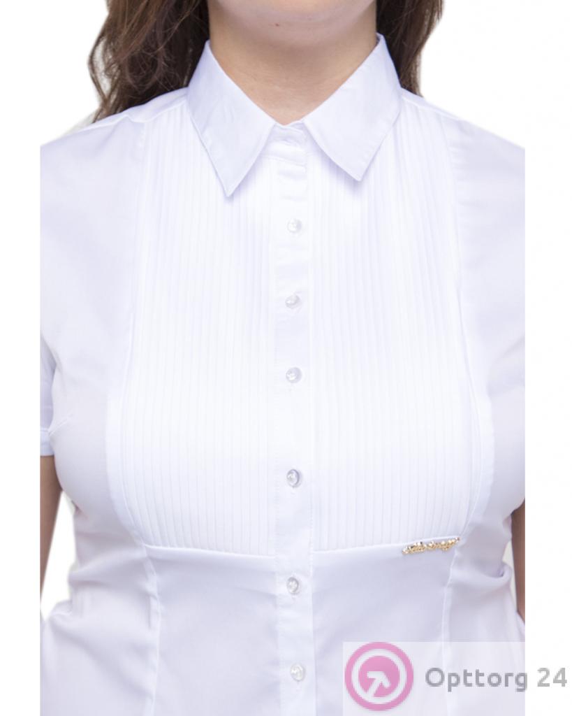 Белая женская блузка с мелкой плиссировкой на груди. Спереди есть небольшая брошь золотистого цвета.