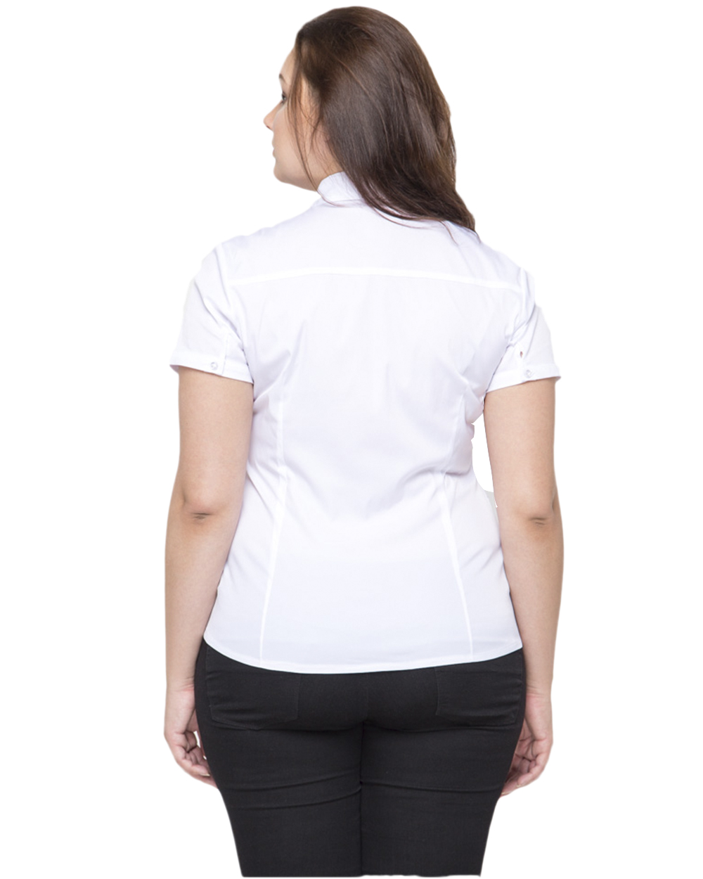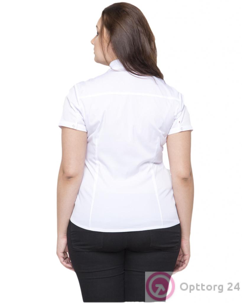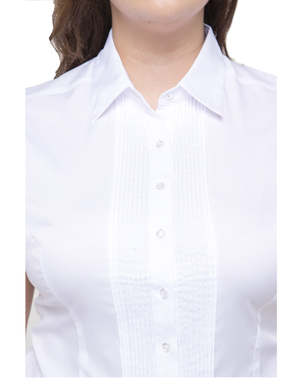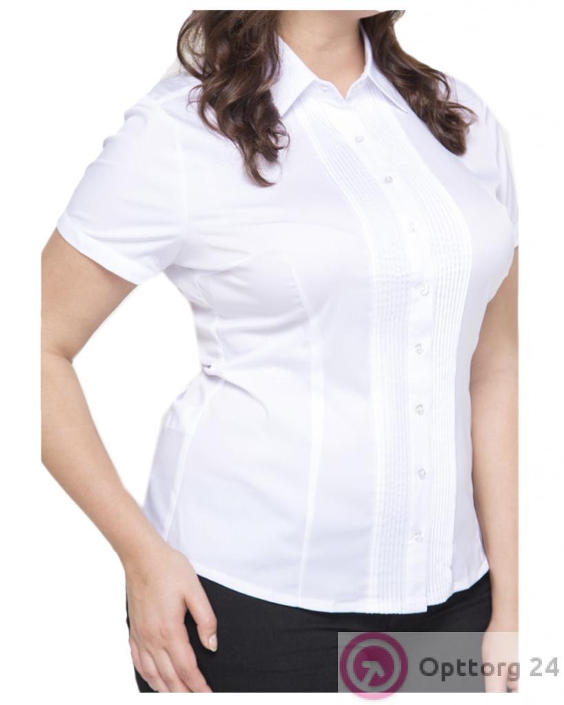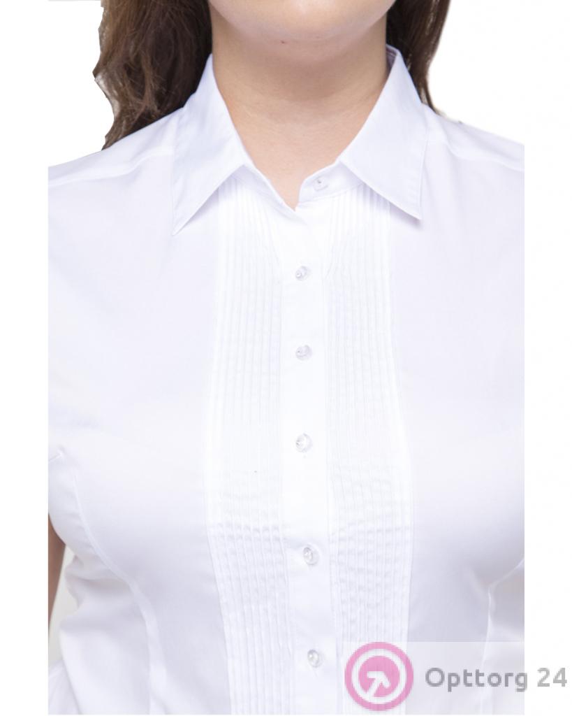 Белая женская блузка с короткими рукавами. Отложной воротник, плиссировка вдоль пуговиц.