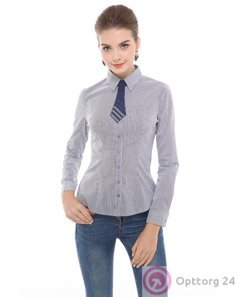 Оригинальная модель женской блузки, дополнена съемным галстуком. Изделие с длинными рукавами, принт в модную тонкую полоску черного цвета. Небольшой темно синий галстук в комплекте прекрасно дополнит деловой образ.