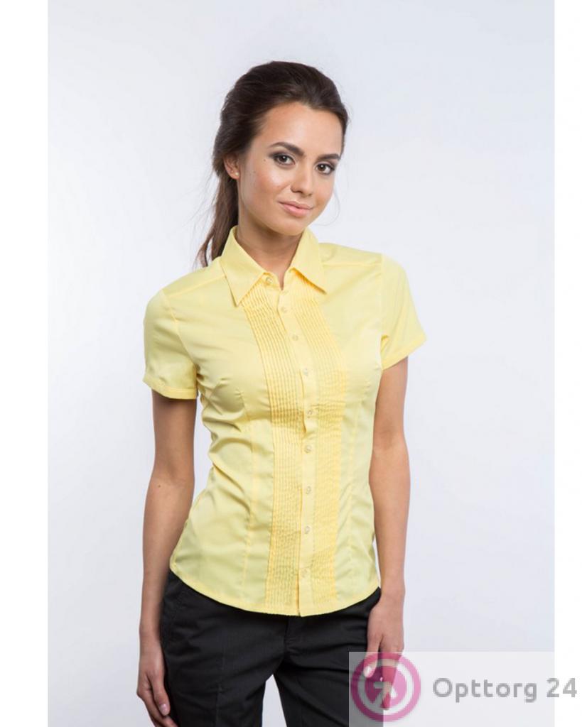 Желтая блузка с короткими рукавами. Модель спереди украшена оборками. Крассический отложной воротник.