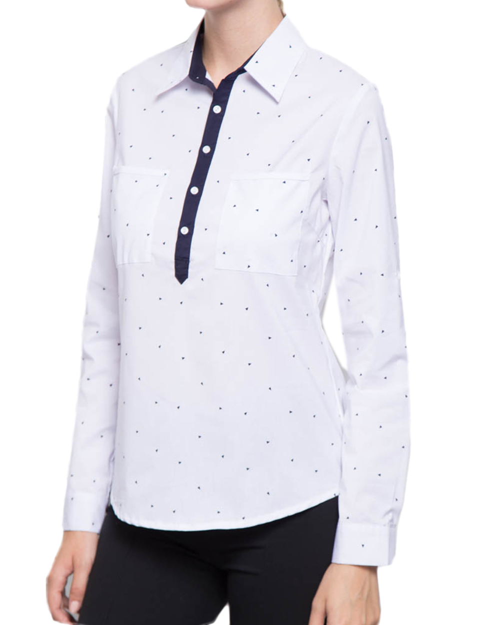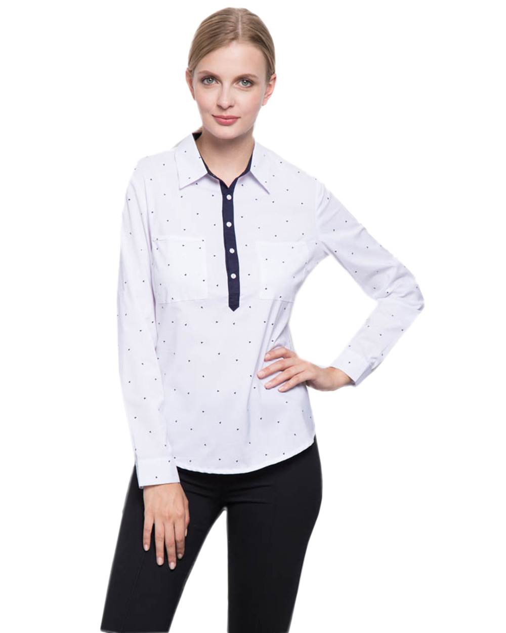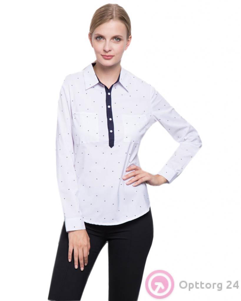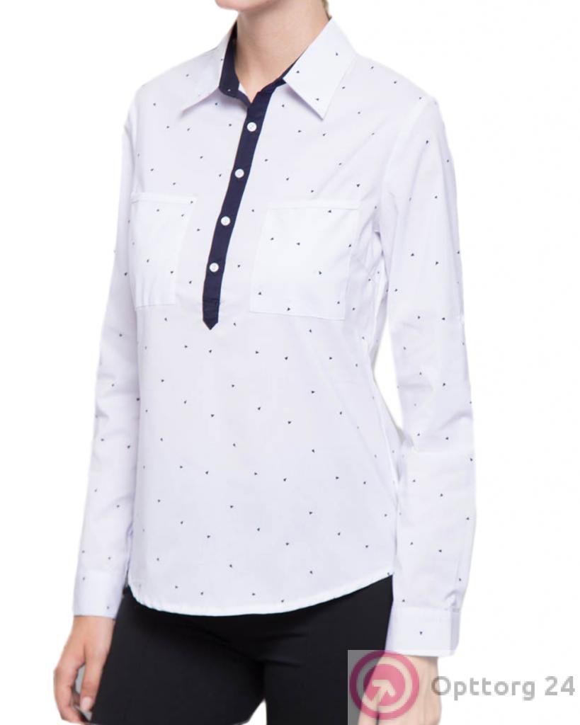 Женская блузка белого цвета с застежкой на пуговицы. Длинные рукава и два накладных кармана на груди.