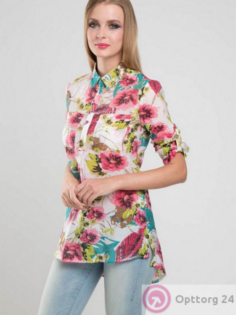 Женская блузка белого цвета с узором в виде цветов. Изделие имеет 2 кармана на груди и вырезом на пуговицах. Модель с рукавами 3/4.