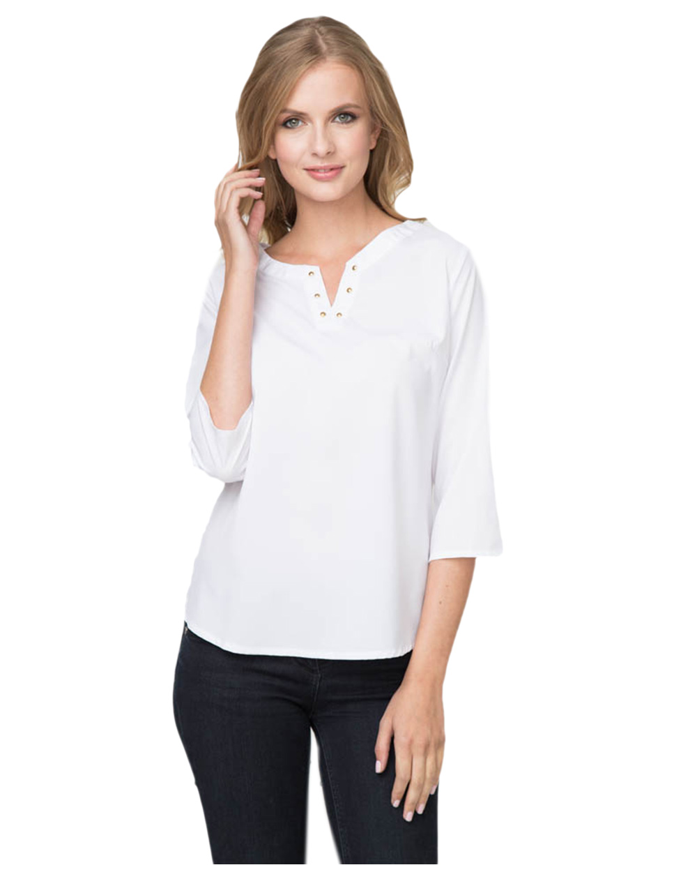 Красивая беая блузка полуприталенного кроя. Спереди V-образная горловина и клепки.