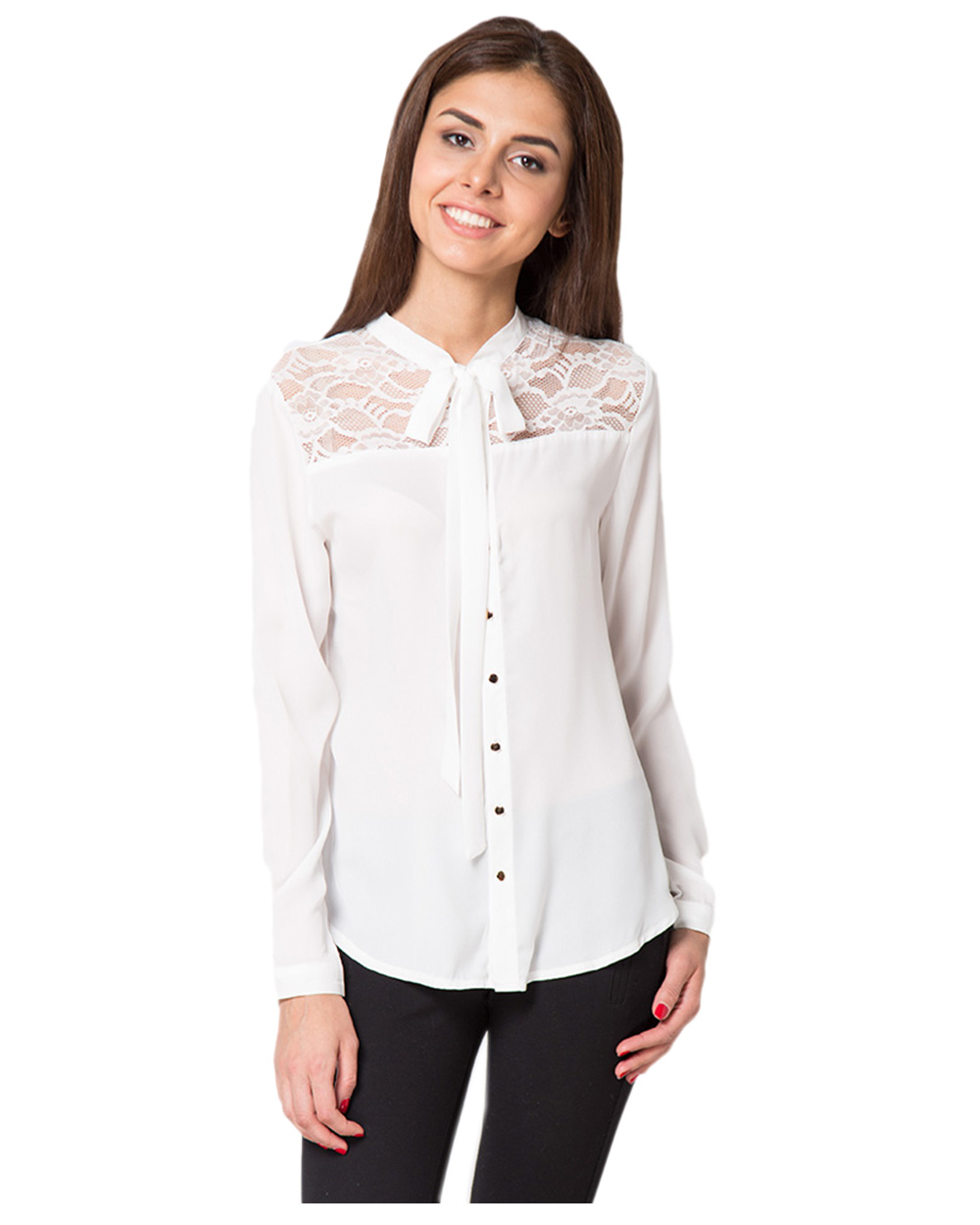 Нежная нарядная женская блузка белого цвета с ажурной вставкой. Легкая струящаяся ткань, прямой крой.