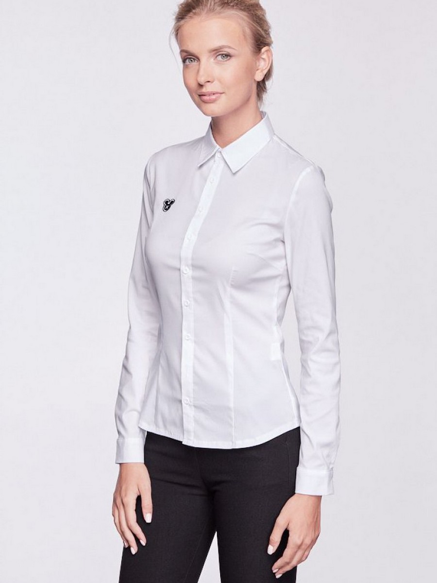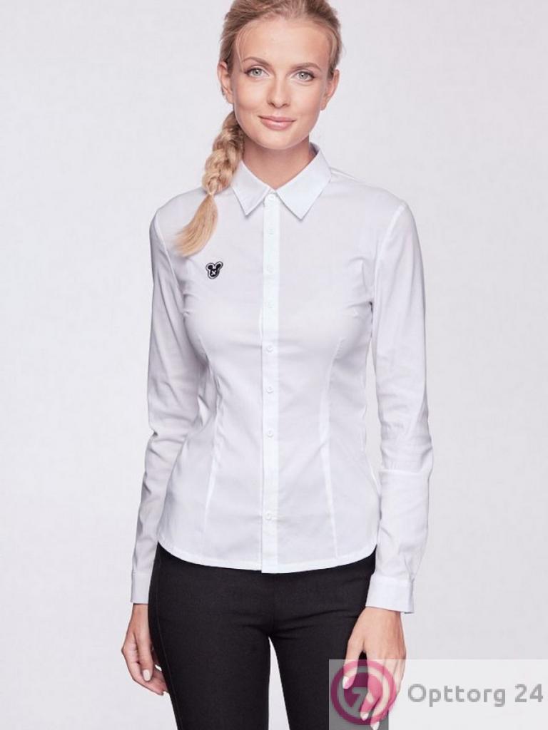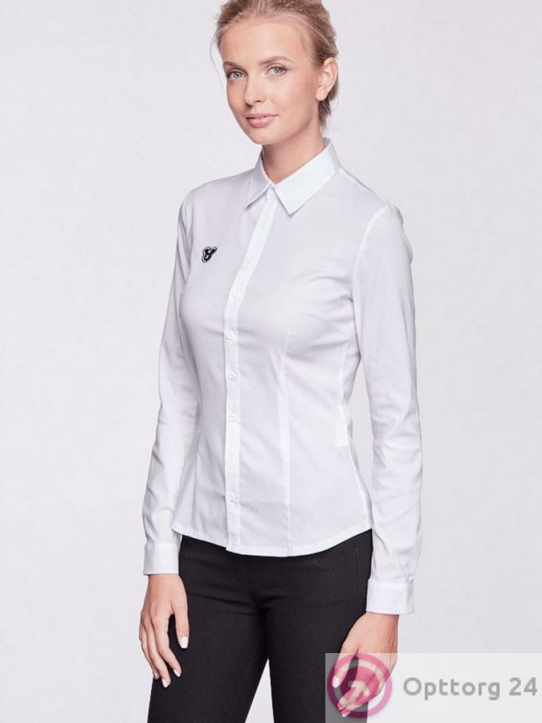 Белая классическая блузка для молодых женщин с нашивкой в виде Микки Мауса. Приталенная модель с длинными рукавами.