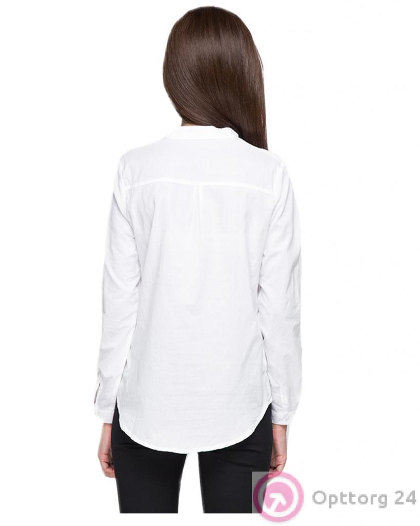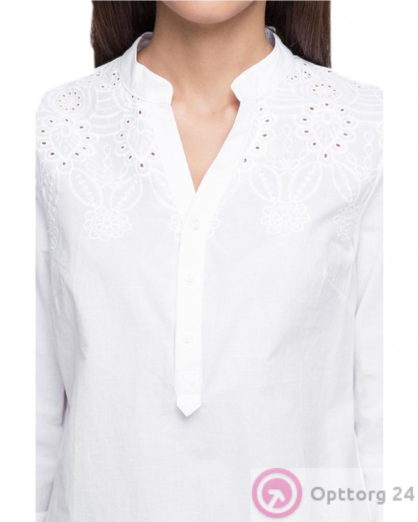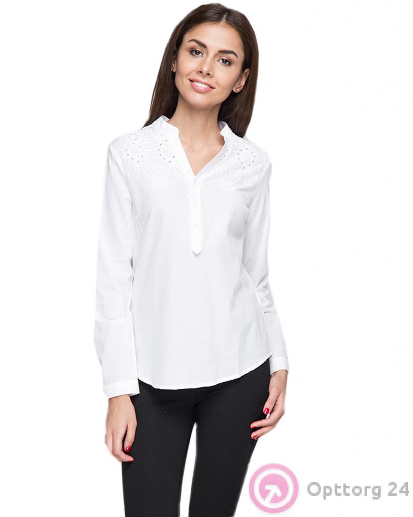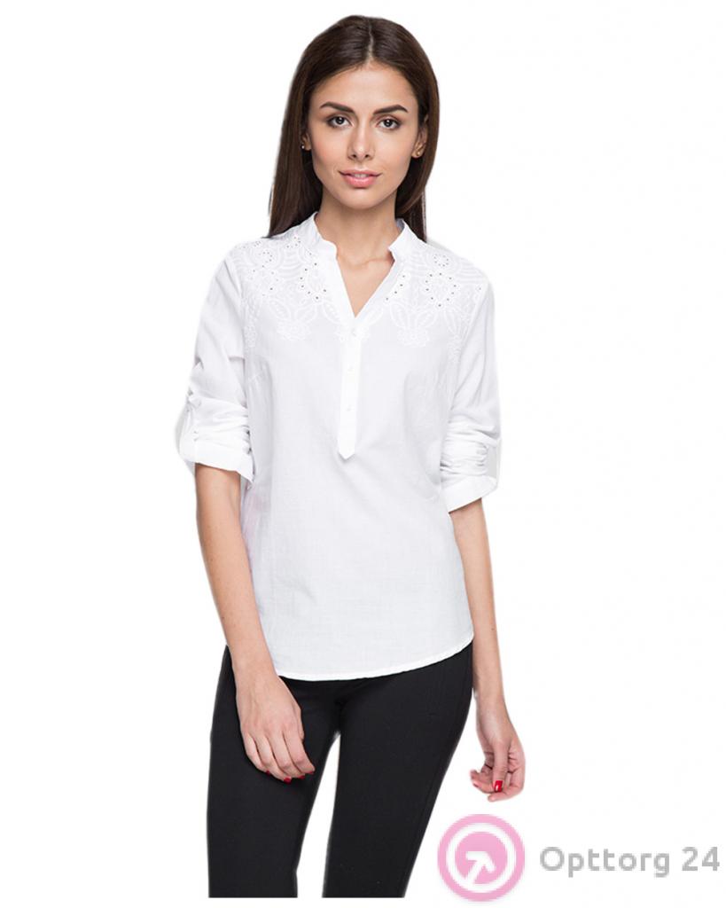 Элегантная белая блугка приталенного кроя. Модель дополнена перфорацией на плечах. Блузка имеет воротник-стойку и V-образную горловину.