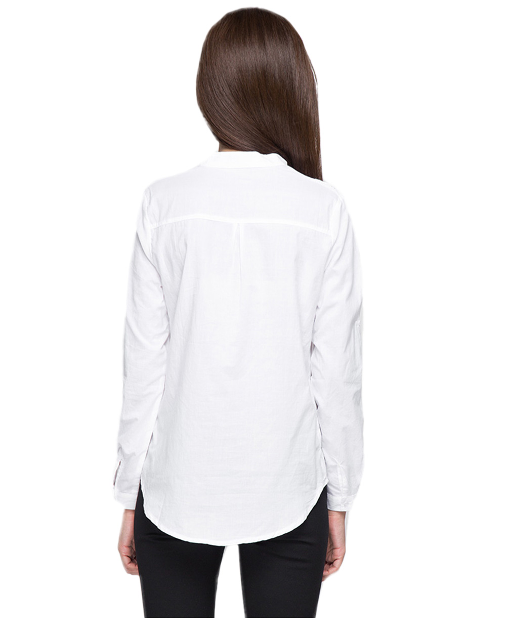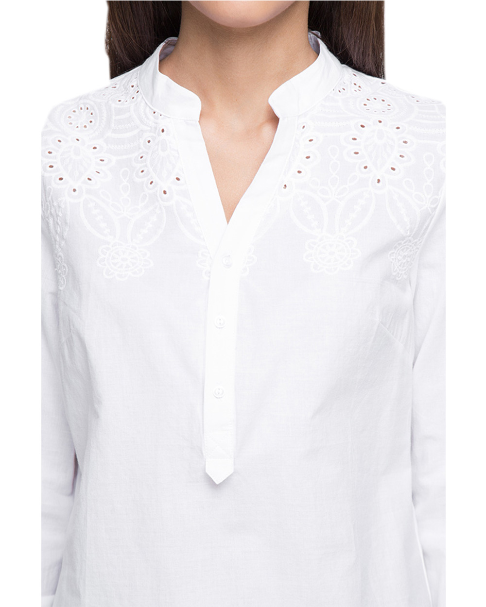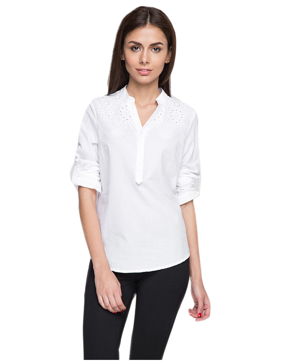 Элегантная белая блугка приталенного кроя. Модель дополнена перфорацией на плечах. Блузка имеет воротник-стойку и V-образную горловину.