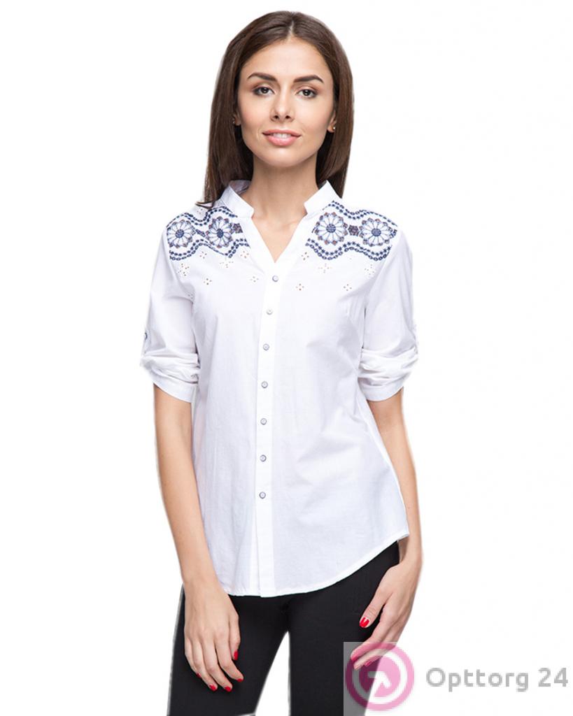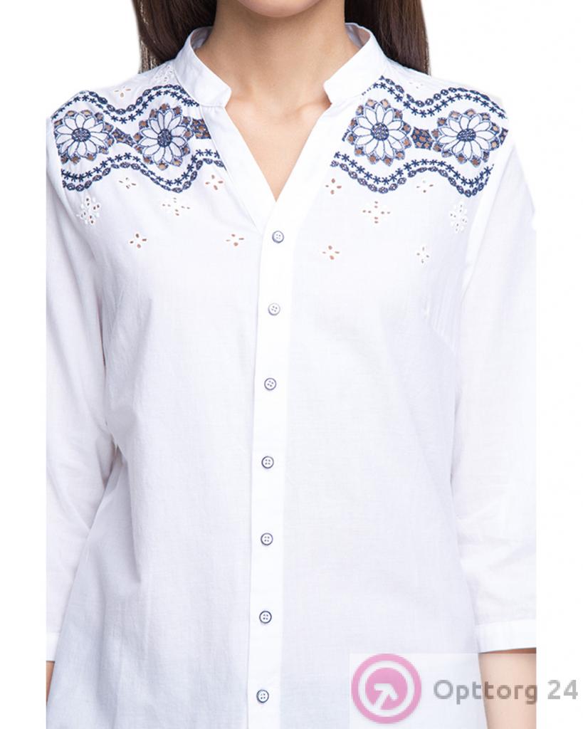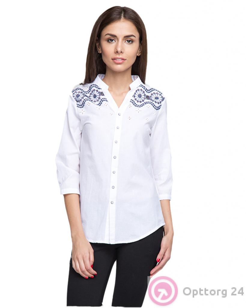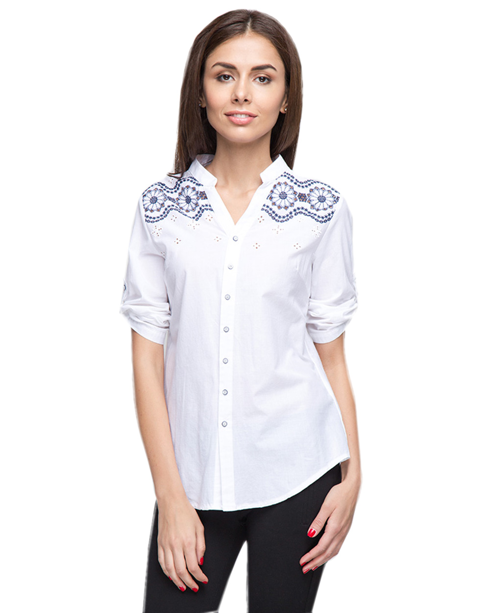 Женская блузка полуприлегающего кроя. Модель дополнена вышивкой и перфорацией.