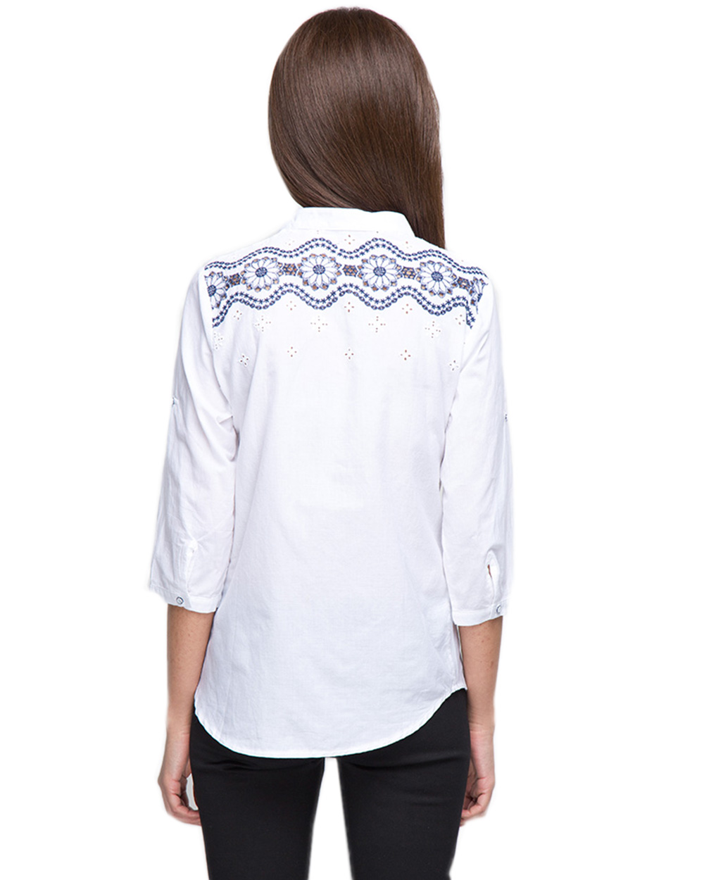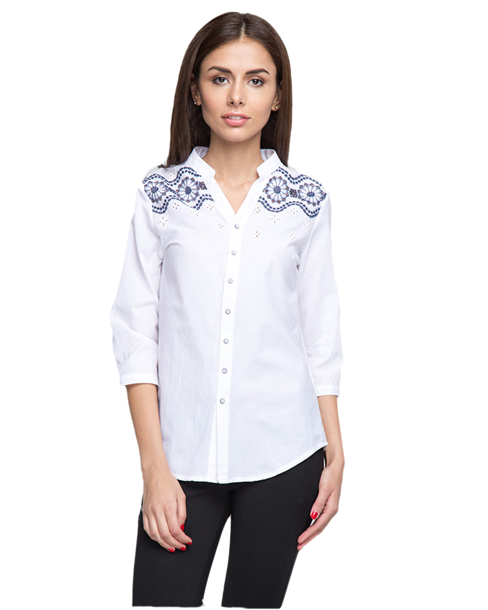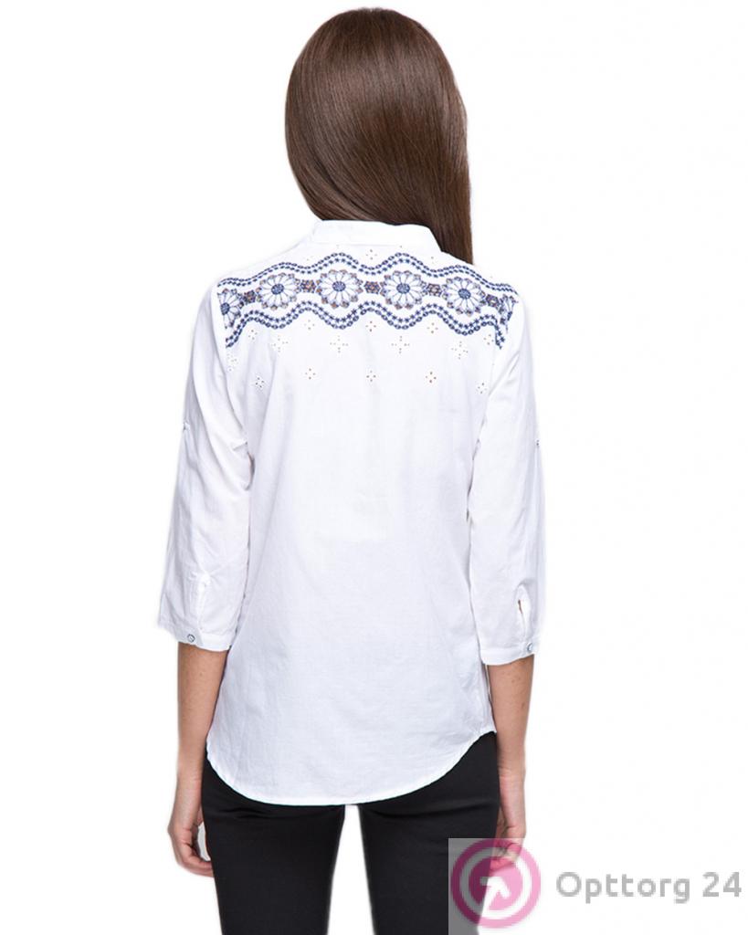 Женская блузка полуприлегающего кроя. Модель дополнена вышивкой и перфорацией.