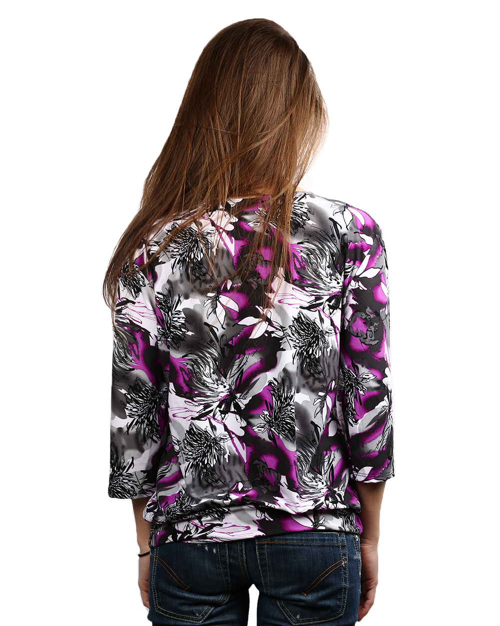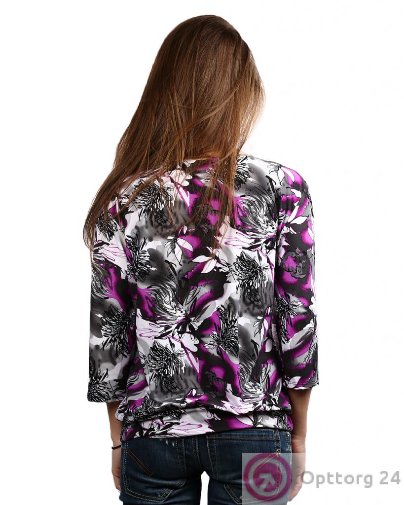 Блузка женская бело-серого цвета с сиреневым принтом оптом