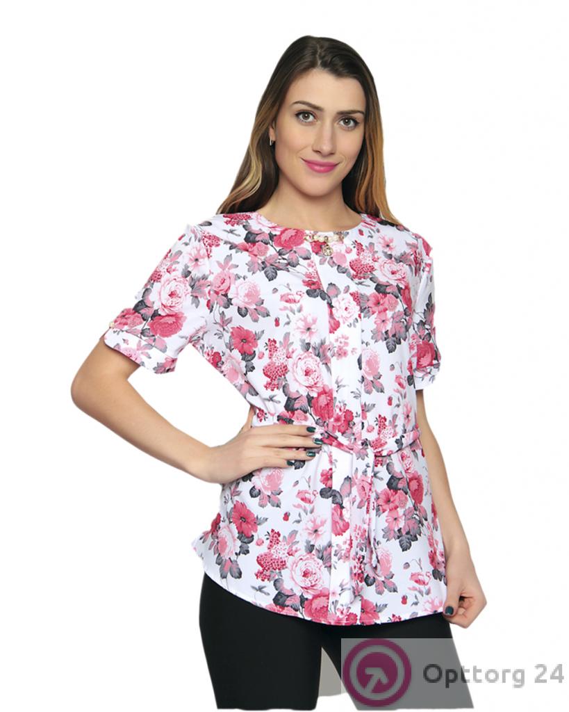Красивая женская блузка с поясом по линии талии. Округлая горловина, короткие рукава.