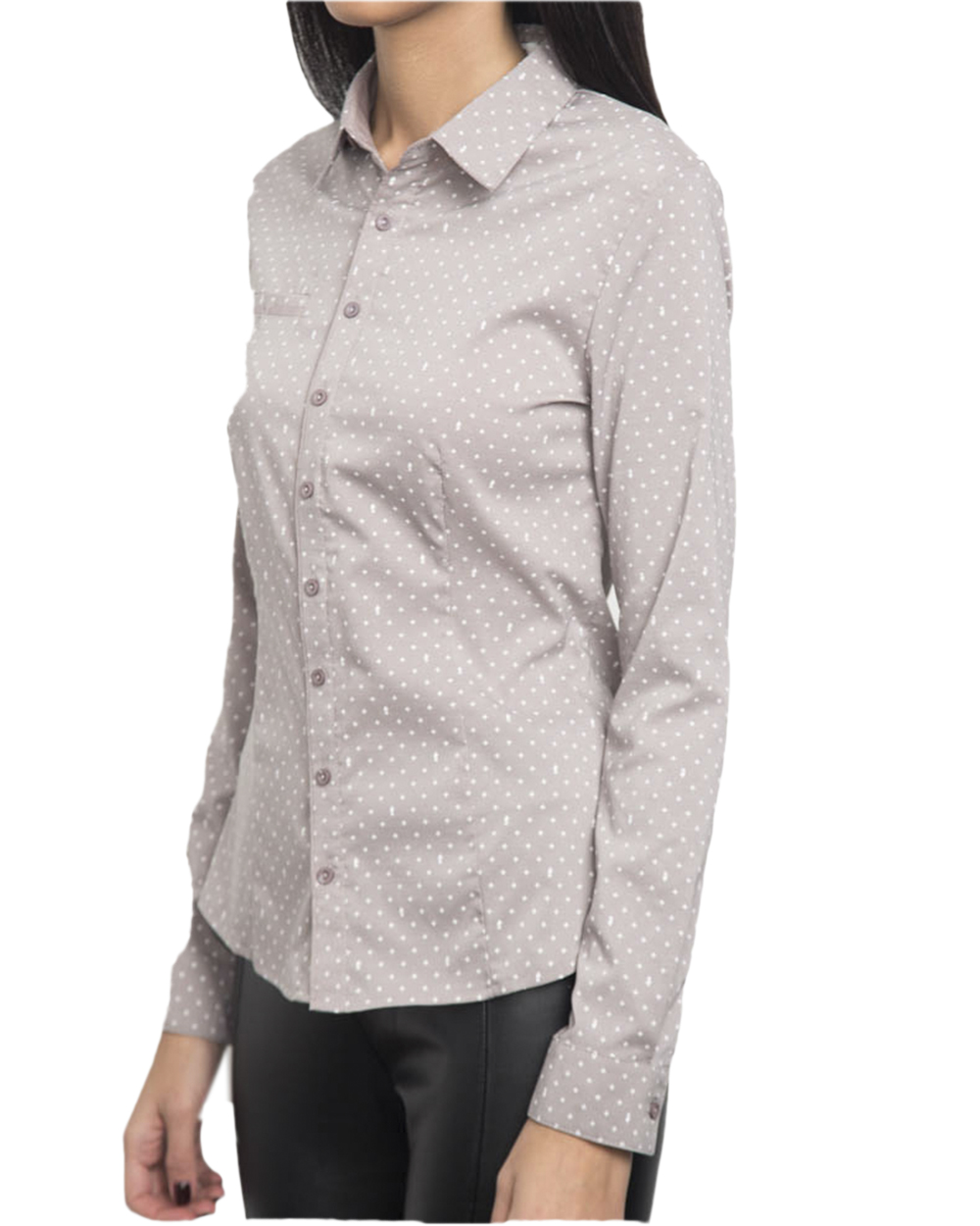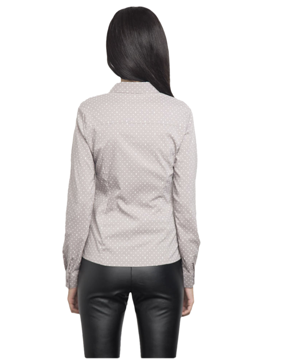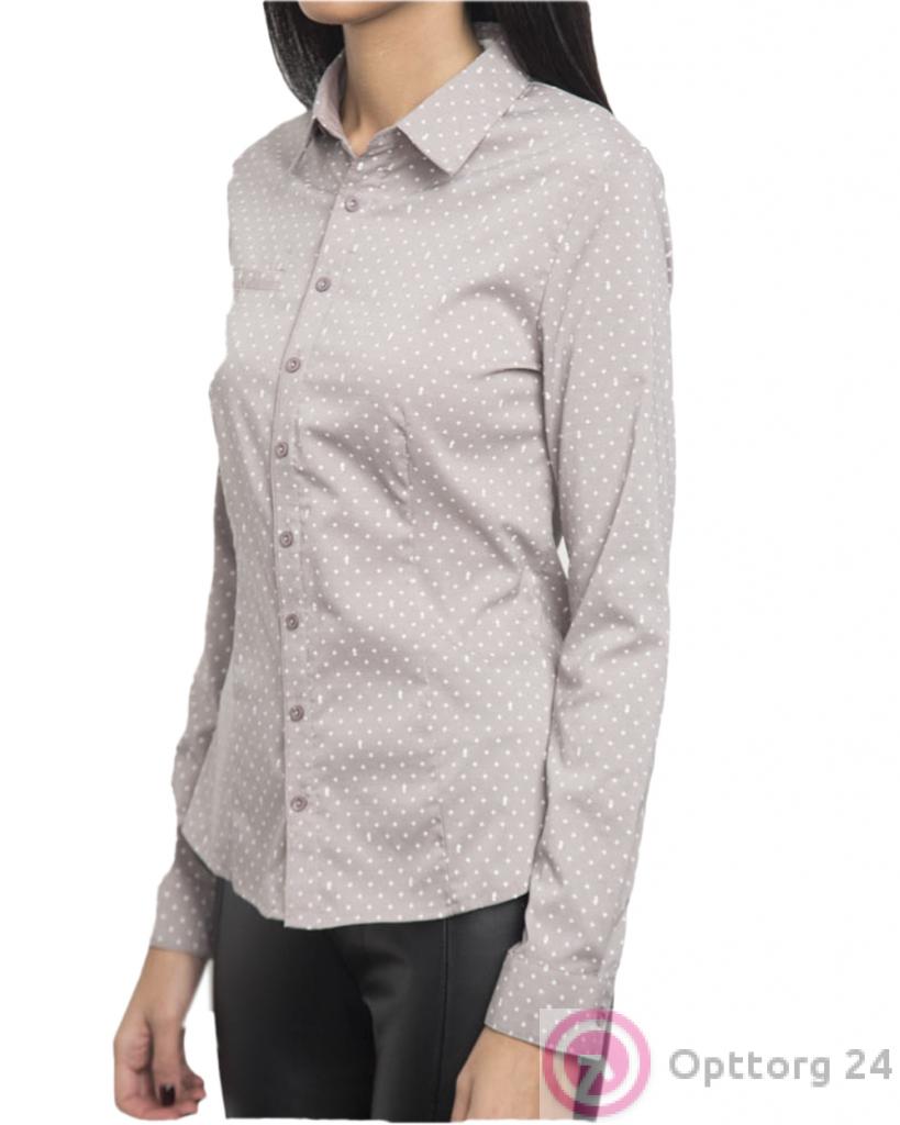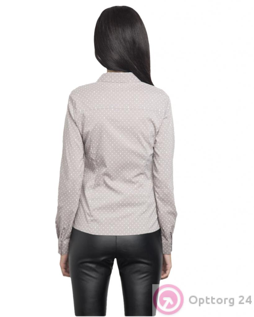 Симпатичная бежевая блузка с принтом в горохи. Застегиваются на пуговицы.
