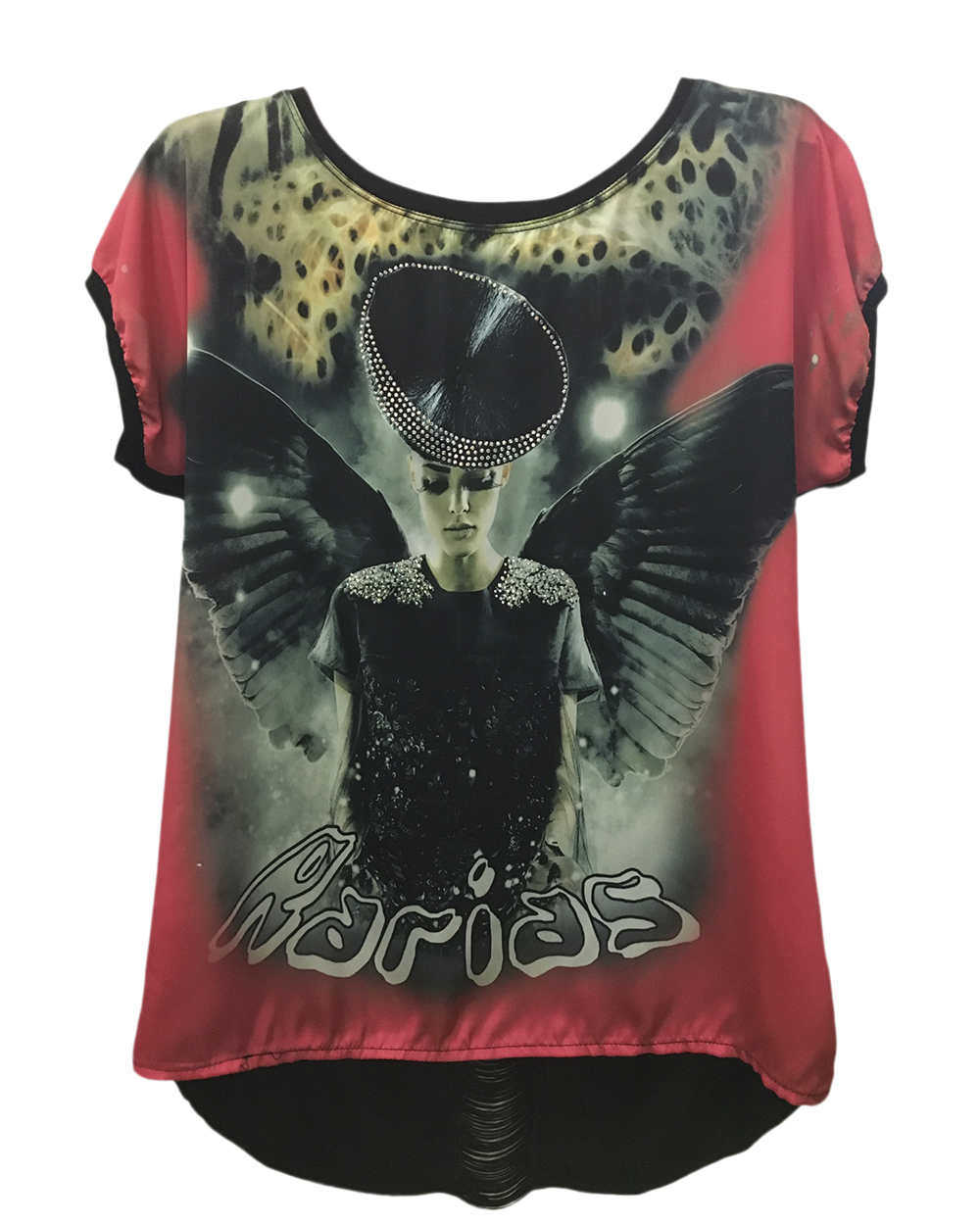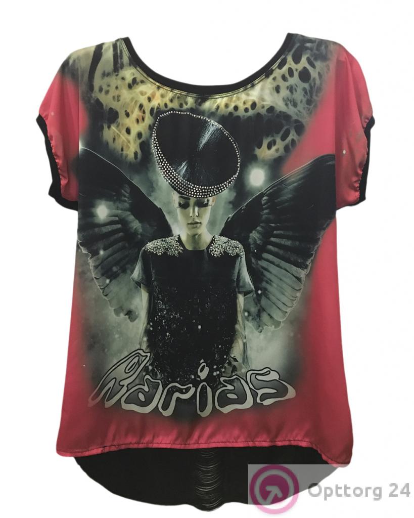 Комфортная женская блузка необычного кроя. Модель удлиненная сзади. Рукава короткие.