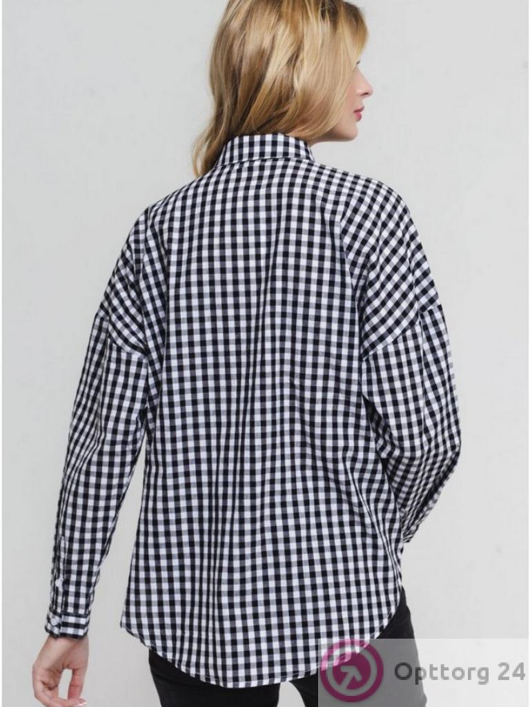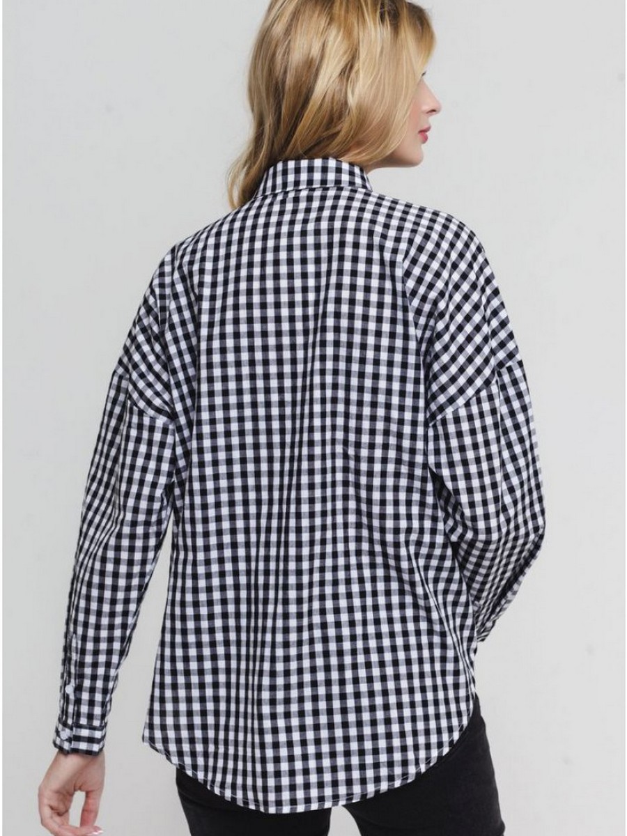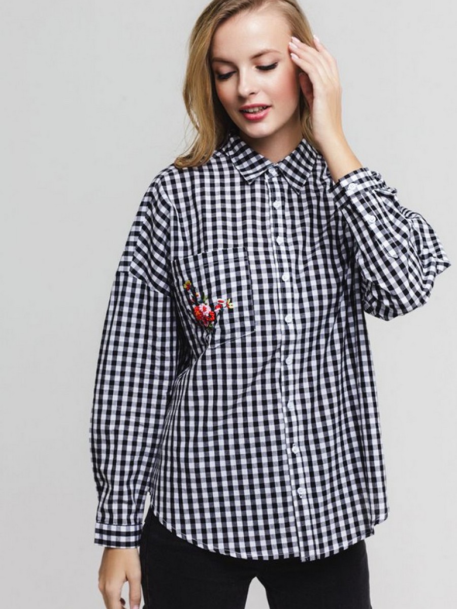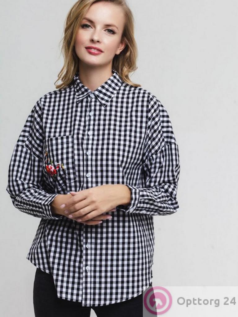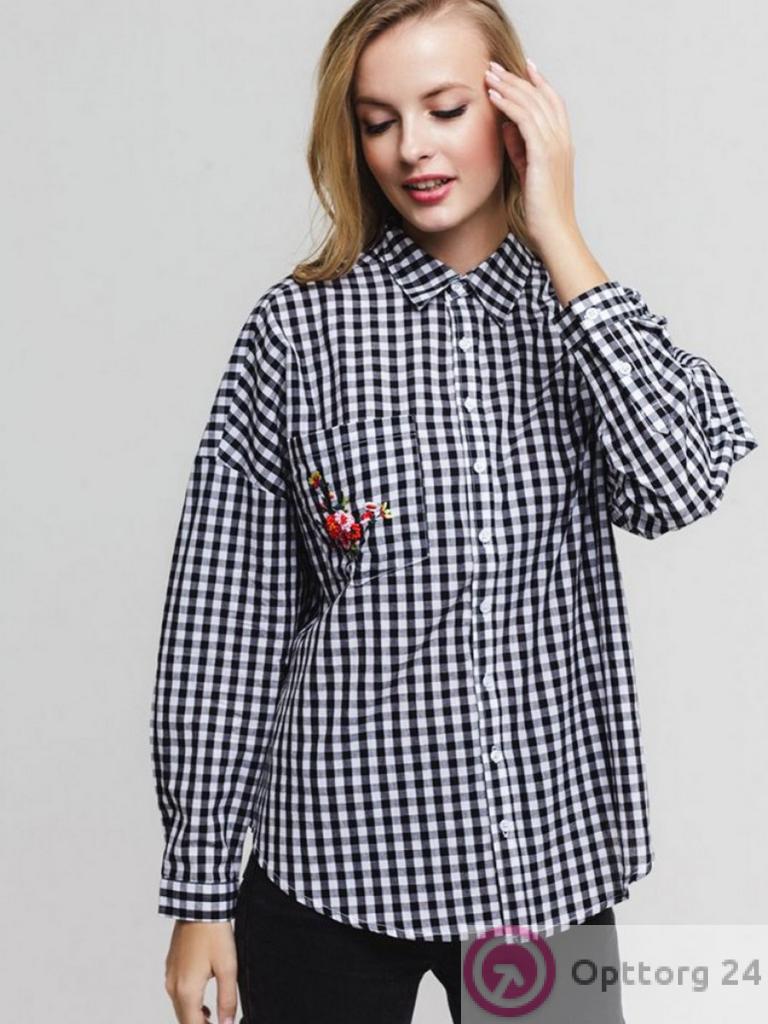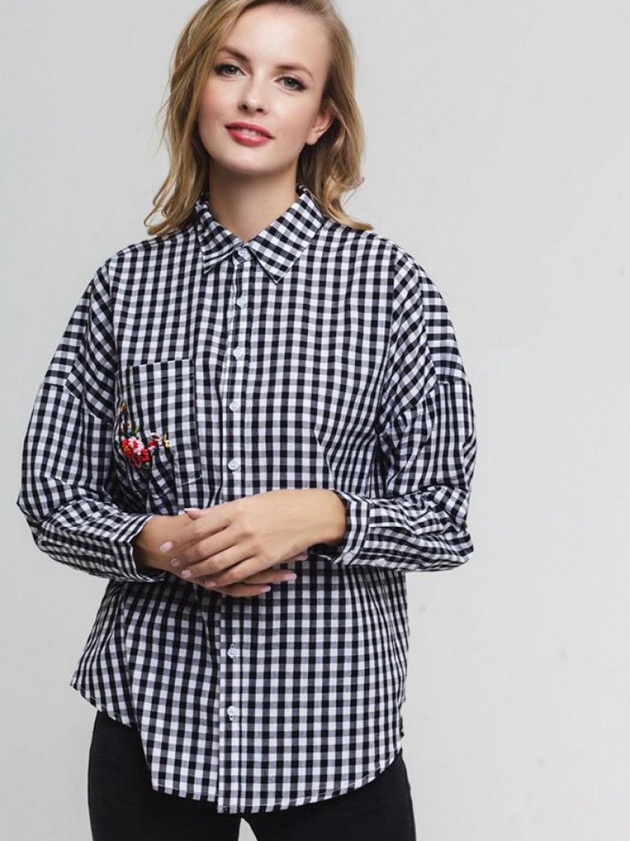 Стильная рубашка черного цвета в клетку с длинными рукавами и застежкой на пуговицах. На груди изделия вышивка в виде цветка Свободный крой