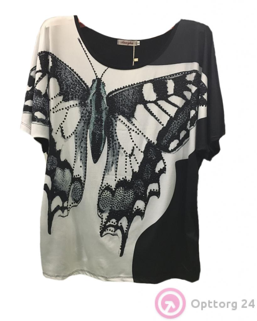 Оригинальная черно белая блузка с изображением бабочки. Свободный крой, округлая горловина.