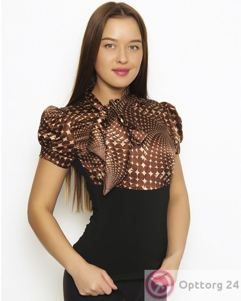 Блузка женская черного цвета с коричневой вставкой и бантом. оптом