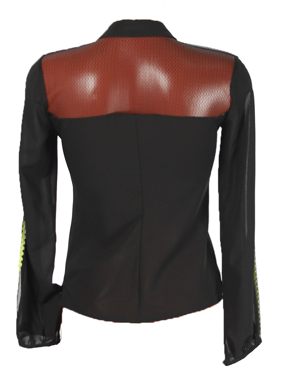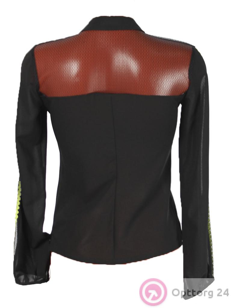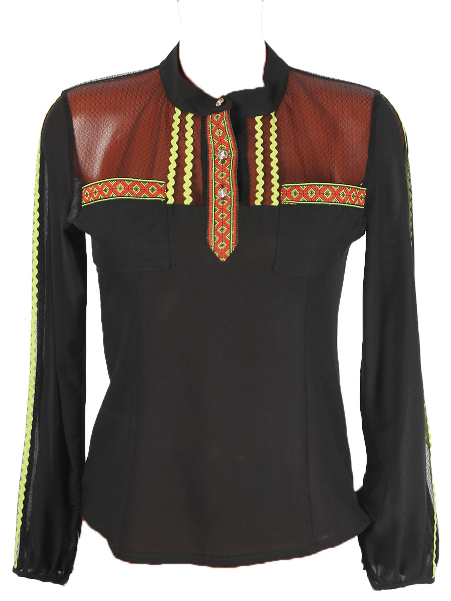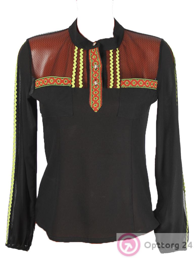 Женская блузка черного цвета с вырезом, Модель украшенна нашивками в украинском стиле.