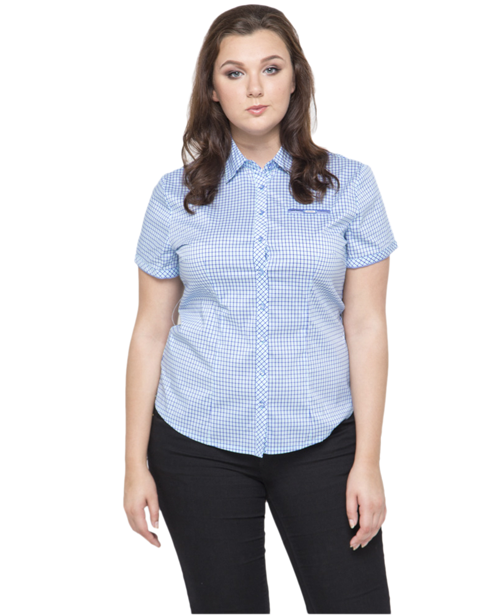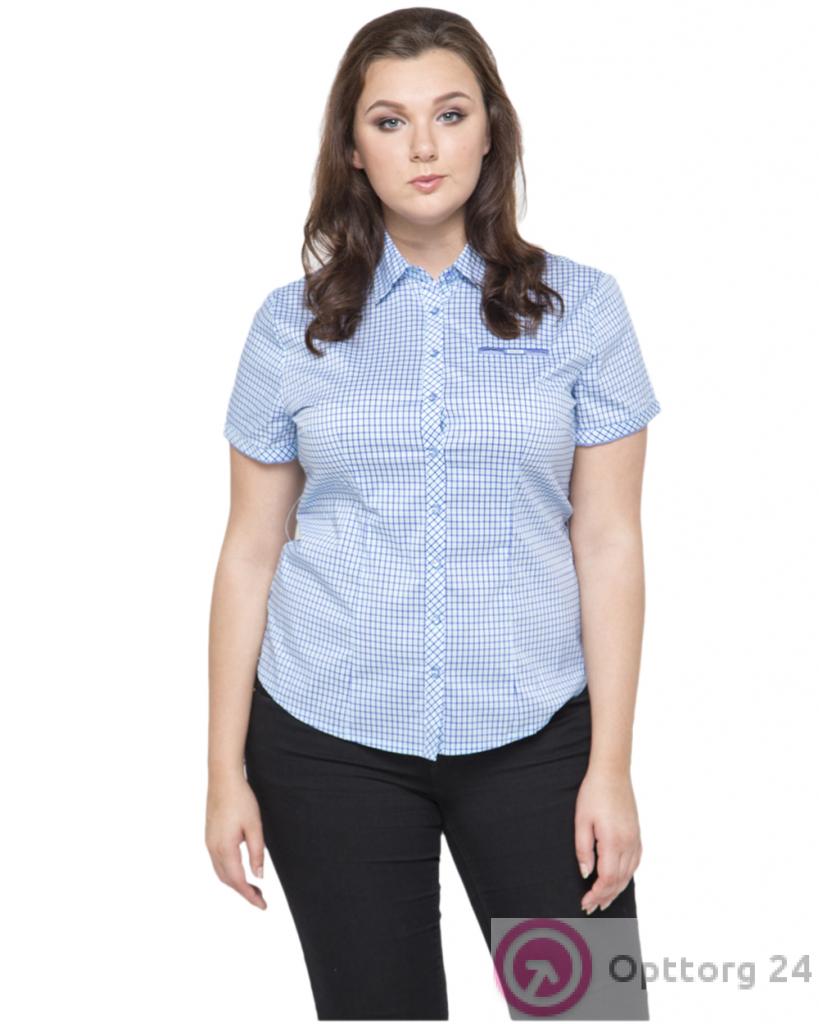 Легкая женская блузка приталенного кроя. Моедль застегивается на пуговицы и имеет короткие рукава.
