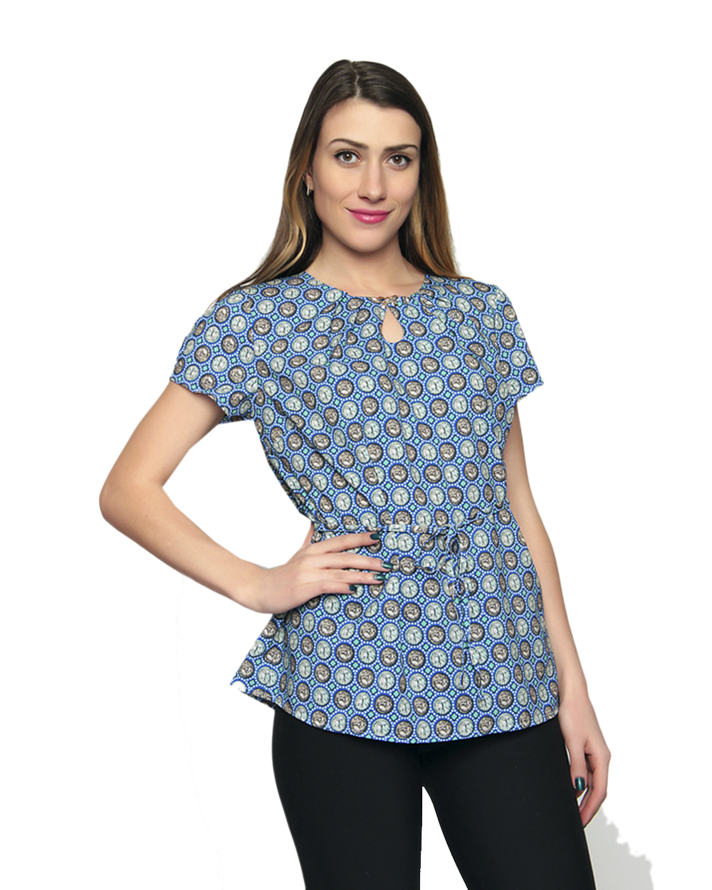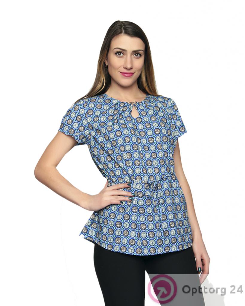 Стильная приталенная блузка с неглубокой округлой горловиной. По линии талии идет тонкий пояс.