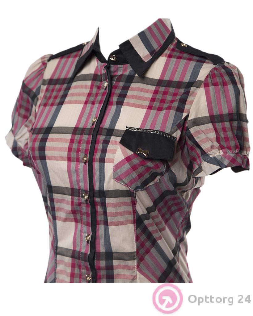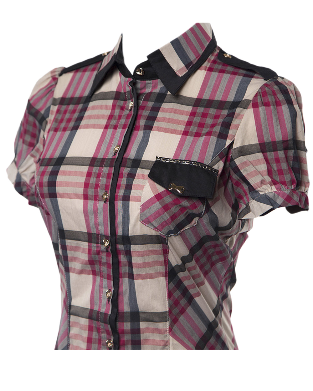 Яркая клетчатая блузка сс короткими рукавами-фонариками. Есть один нагрудный карман и похоны на плечах.