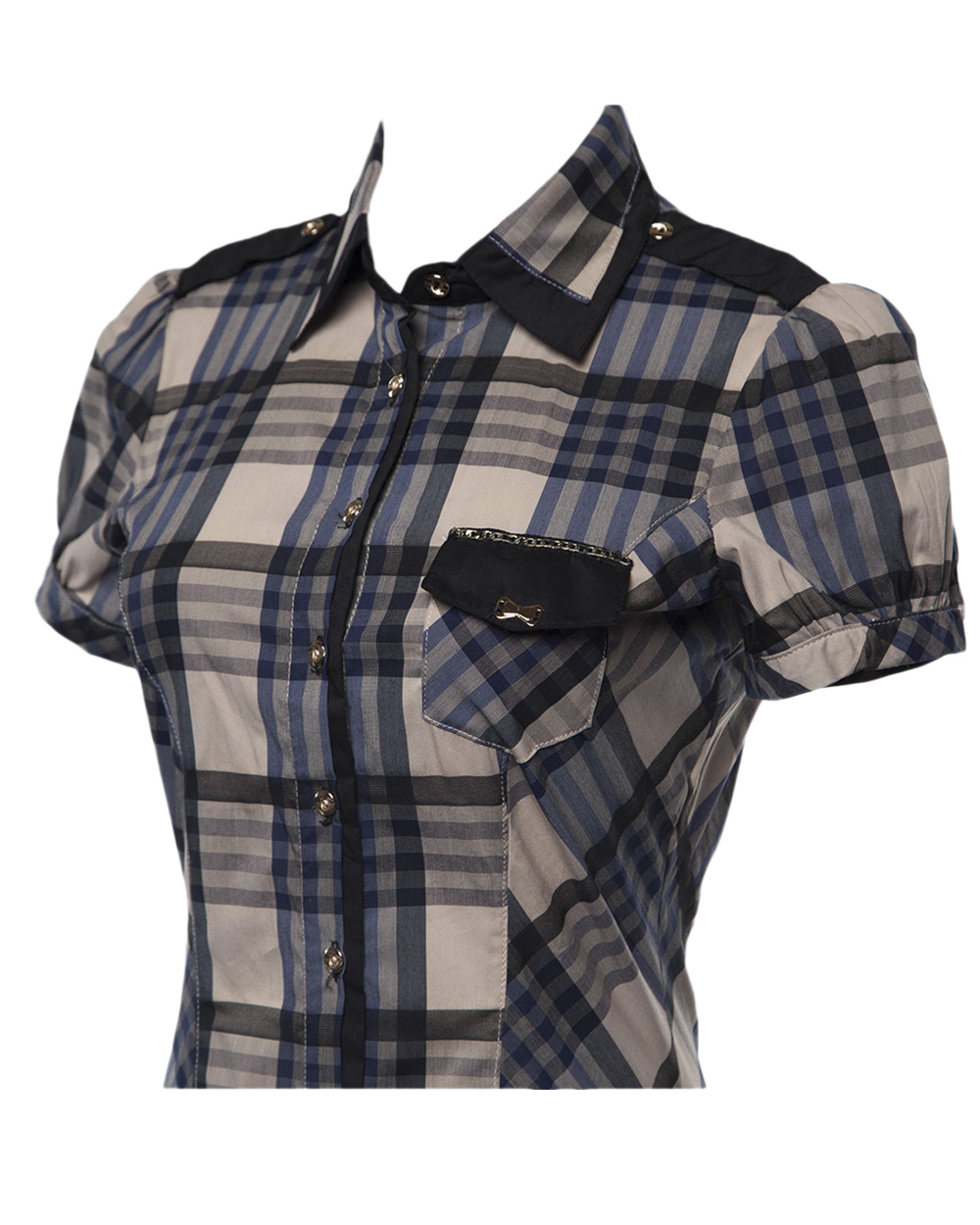 Женская клетчатая блузка темно-синего цвета с рукавами-фонариками. Модель дополнена нагрудным карманом.