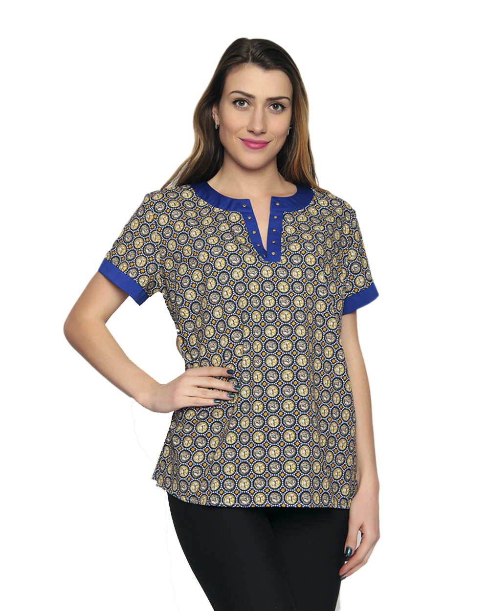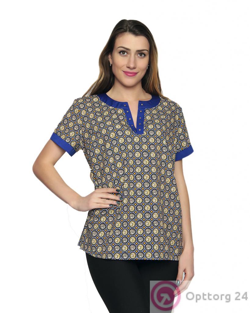 Красивая блузка свободного силуэта. Изюминку модели придает синяя окантовка.