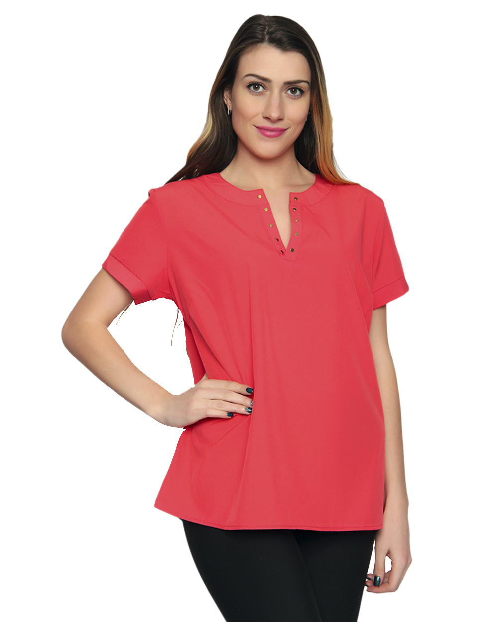 Красивая блузка с окрглой горловиной и небольшим вырезом. Линия выреза украшена заклепками.