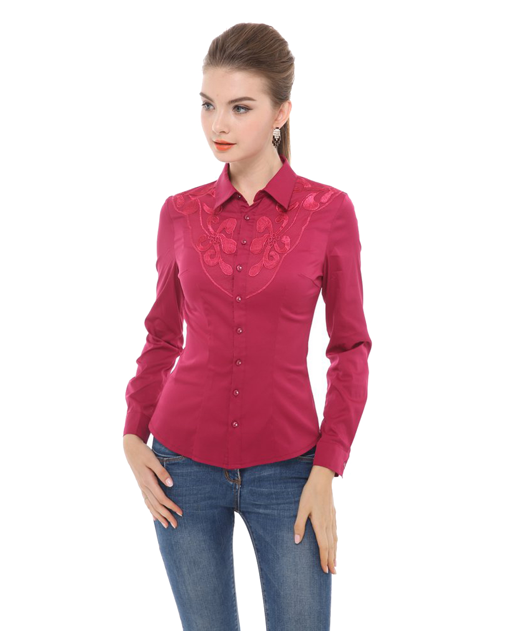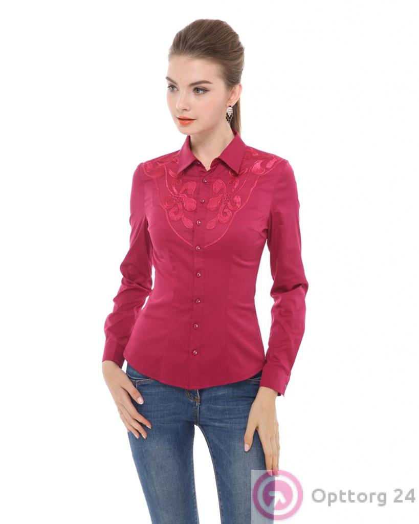 Стильная приталенная блузка красивого малиного цвета, рукава длинные. Верх модели оформлен вышитой цветочной аппликацией. Блузка стильная, отлично дополнит гардероб любой модницы.